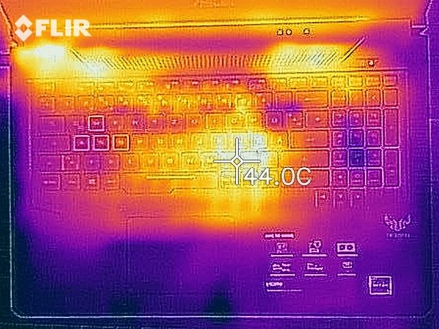 Im Leerlauf arbeiten die Lüfter des FX705DY dauerhaft mit niedriger Geschwindigkeit. Die dabei entstehende Geräuschkulisse ist auszuhalten. Unter Last drehen sie auf. So registrieren wir während unseres Stresstests einen maximalen Schalldruckpegel von 45 dB(A). Im mittleren Lastbereich liegt der Wert bei 38,7 dB(A). Bei aktiviertem Turbo-Modus drehen die Lüfter schneller und stärker auf. Insgesamt wird es noch etwas lauter.