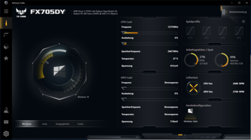 Da unser FX705DY-Modell kein Windows-Betriebssystem mitbringt, haben wir Windows 10 Pro installiert, um unseren Test durchführen zu können. Zusätzlich haben wir das Armoury-Crate-Control-Center installiert. Hierbei handelt es sich um eine von Asus bereitgestellte Software, die u. a. die Wahl eines Energieschemas ermöglicht. Es stehen die Optionen "Leise", "Ausgeglichen", "Turbo" und "Windows" zur Verfügung. Wird Letztere gewählt, übernimmt die Windows-Energieverwaltung die Kontrolle. Diese Option wurde zur Durchführung unseres Tests verwendet.