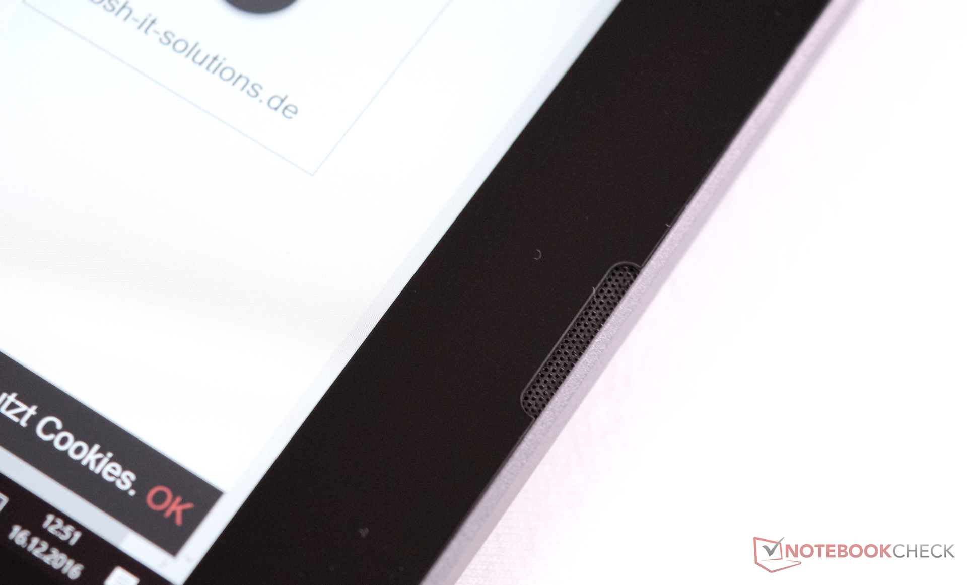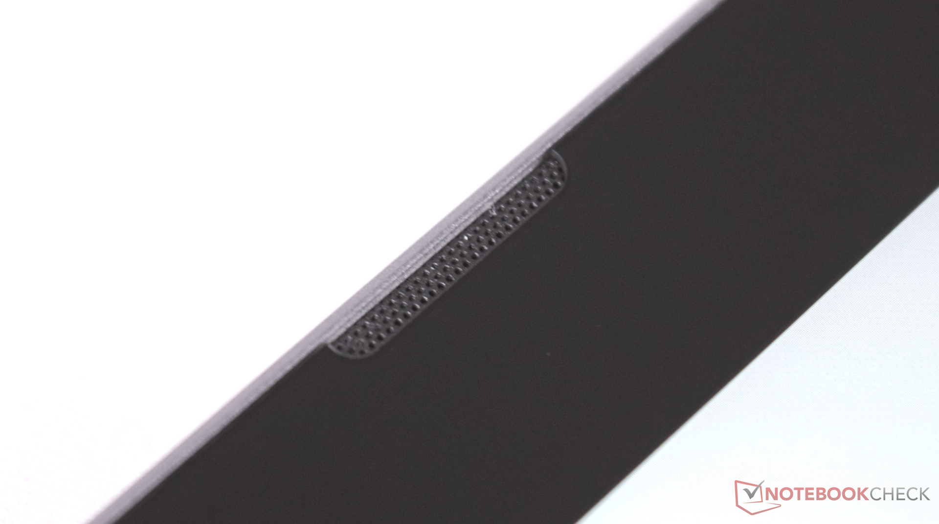 Die beiden Lautsprecher, welche vorderseitig am Rand platziert sind, kommen aus dem Hause Harman/Kardon. Auf Grund der designbedingten Kompaktheit kann sich der Sound der kleinen Lautsprecher durchaus hören lassen, gleichwohl sollte hier aber nicht zu viel erwartet werden. Konstruktionsbedingt überwiegen Höhen und Mitten. Für Bässe reicht das beschränkte Volumen der kleinen Speaker nicht aus. Zum Skypen ist das Tablet gut geeignet. Das Array-Mikrofon befindet sich im oberen Displaybereich und filtert gut Störgeräusche heraus. Selbst beim Videochat unter Volllast war keine Geräuschbelastung durch den sich drehenden Lüfter bei der Gegenstelle zu hören. Für den uneingeschränkten Sound-Genuss empfehlen wir jedoch, ein externes 2.1-Sound-System oder ein gutes Headset zu verwenden. Passende Anschlüsse sind an dem Tablet vorhanden.