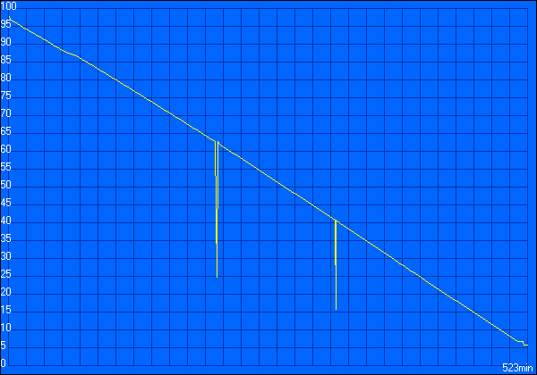 Laut Asus liegt die Akkulaufzeit bei "bis zu 8 Stunden". Bei unserem WLAN-Test ruft ein Skript alle 40 Sekunden eine Webseite auf, bis der Akku leer ist. Mit dem ausbalancierten Energieprofil und einer Bildschirmhelligkeit von 150 cd/m² konnten wir 8 Stunden und 45 Minuten ermitteln. Mit einer geringeren Helligkeit sollten sogar 10 Stunden möglich sein – ein exzellentes Ergebnis, das sogar die Herstellerangabe übertrifft. Die Ausreißer in dem Diagramm auf der rechten Seite traten an verschiedenen Stellen auf, wenn wir den Test wiederholten. Bisher haben wir keine Erklärung für das Verhalten. Das Acer Aspire R11 R3-131T schafft im WLAN-Test rund 2 Stunden mehr, was angesichts des deutlich größeren Akkus (50 Wh vs. 38 Wh) aber nicht überraschend ist. Nichtsdestotrotz sollte das TP200SA einen kompletten Arbeitstag überstehen.