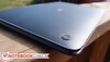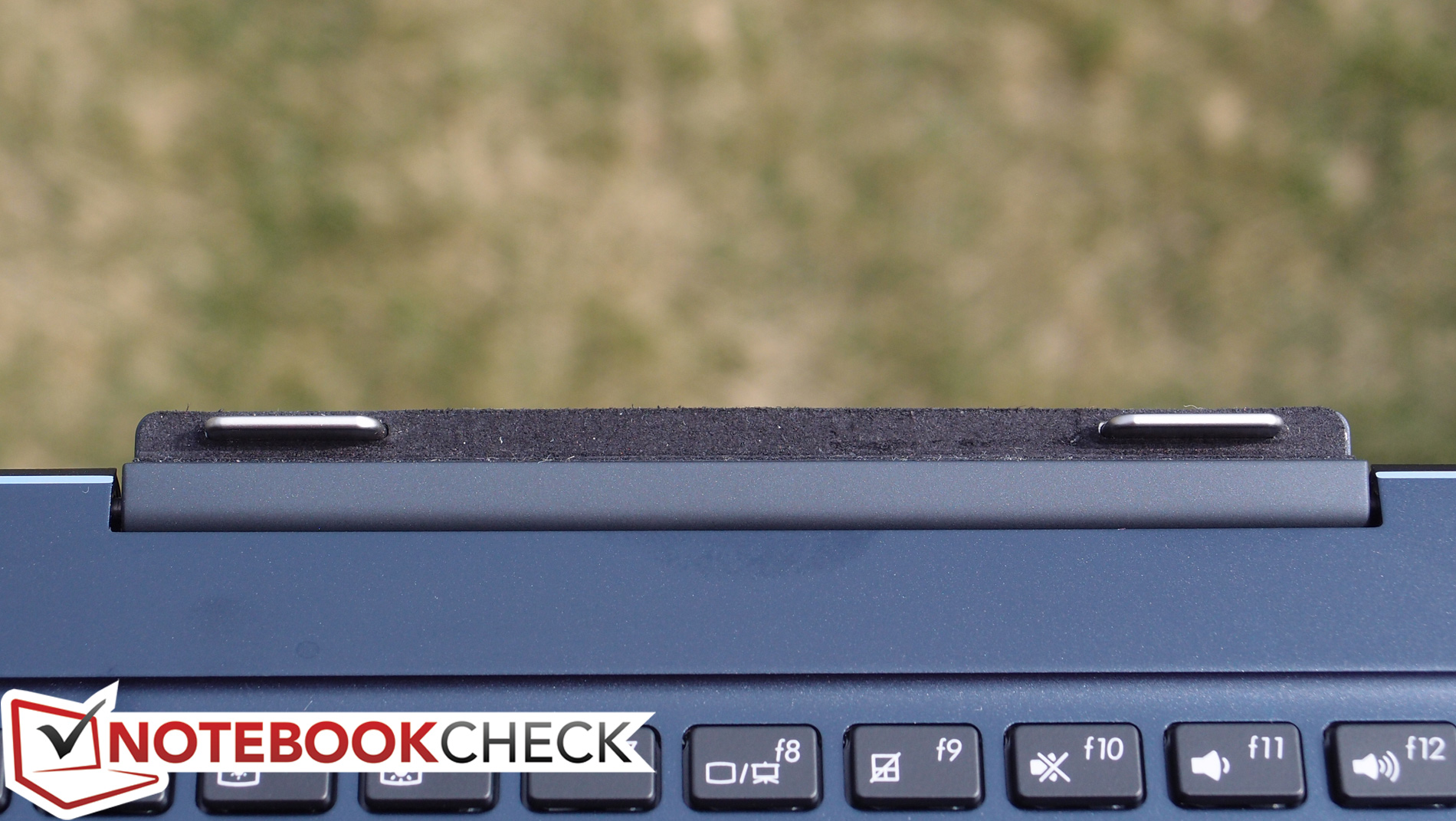 Die runden Gummifüße bieten eine ordentlich Stabilität, wenn man das Gerät irgendwo abstellt. Zudem ist das Convertible im Laptop-Modus leicht angewinkelt, was das ansonsten leicht bedrängte Tippen etwas angenehmer macht. Die Benutzung der kleinen Handballenauflage, welche bei dieser Größe kaum zu verhindern ist, ist bei größeren Händen leider nicht sehr angenehm, aber zumindest hinterlässt die abgeschrägte Metallkante an der Front keine unangenehmen Druckstellen an den Handgelenken.