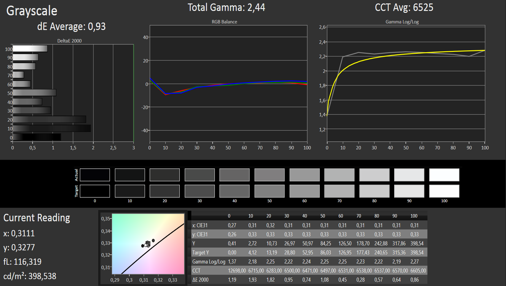 Mit einer Kalibrierung lassen sich die Ergebnisse deutlich verbessern. Am meisten profitiert die Graustufendarstellung (DeltaE-2000: 0,93), aber auch die Farben und die Farbtemperatur können verbessert werden. Bei den Farben verringert sich die durchschnittliche Abweichung auf nur noch 3,74, allerdings sind die Ausreißer bei den Blautönen in abgeschwächter Form immer noch vorhanden. Die Farbtemperatur liegt mit 6.525 K jetzt sehr nah am Idealwert (6.500 K).