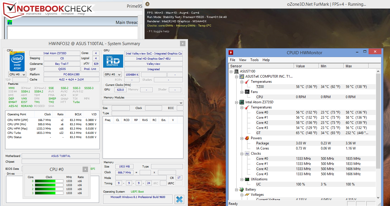 Das Transformer Book wird von einem Atom-Z3735D-Vierkernprozessor angetrieben. Dieser kann dank seiner sehr niedrigen TDP (<4 Watt) passiv gekühlt werden. Der Prozessor arbeitet mit einer Basisgeschwindigkeit von 1,33 GHz; per Turbo kann die Geschwindigkeit auf 1,83 GHz gesteigert werden. Vom Turbo wird auch Gebrauch gemacht. Die volle Rechenleistung konnte bei der Ausführung des CPU-Tests des Cinebench Benchmarks aber nicht abgerufen werden. Der Multi-Thread-Test wird mit konstanten 1,58 GHz bearbeitet. Den Single-Thread-Test durchläuft der Prozessor größtenteils mit 1,58 GHz. Immer wieder wird er auf Geschwindigkeiten unterhalb von 1 GHz abgebremst. Das Verhalten ist im Netz- und im Akkubetrieb gleich. Da die CPU nie ihre Maximalgeschwindigkeit nutzt, fallen die Resultate in den von uns durchgeführten CPU Benchmarks etwas schlechter aus als bei vergleichbaren Geräten.