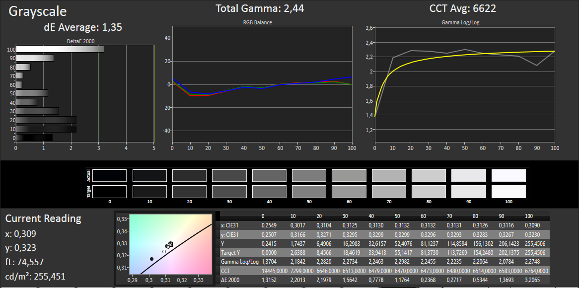 ΔE Greyscale Calman: 1.35 | ∀{0.09-98 Ø5}