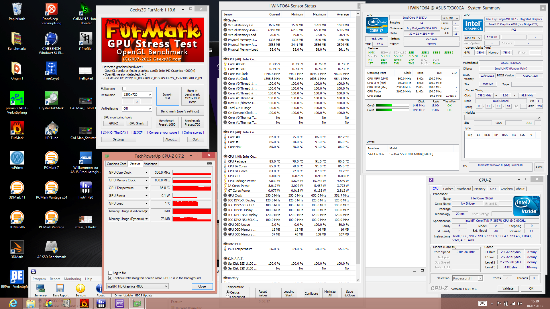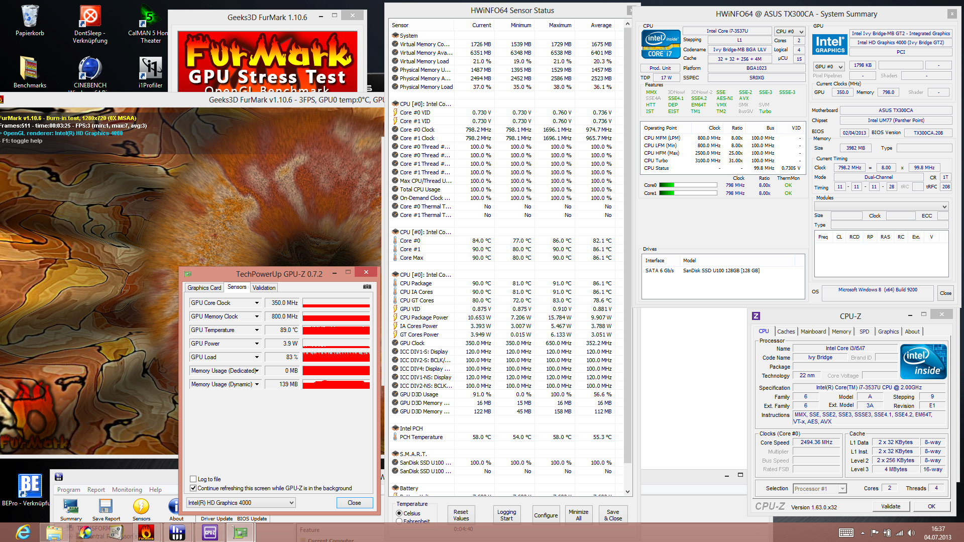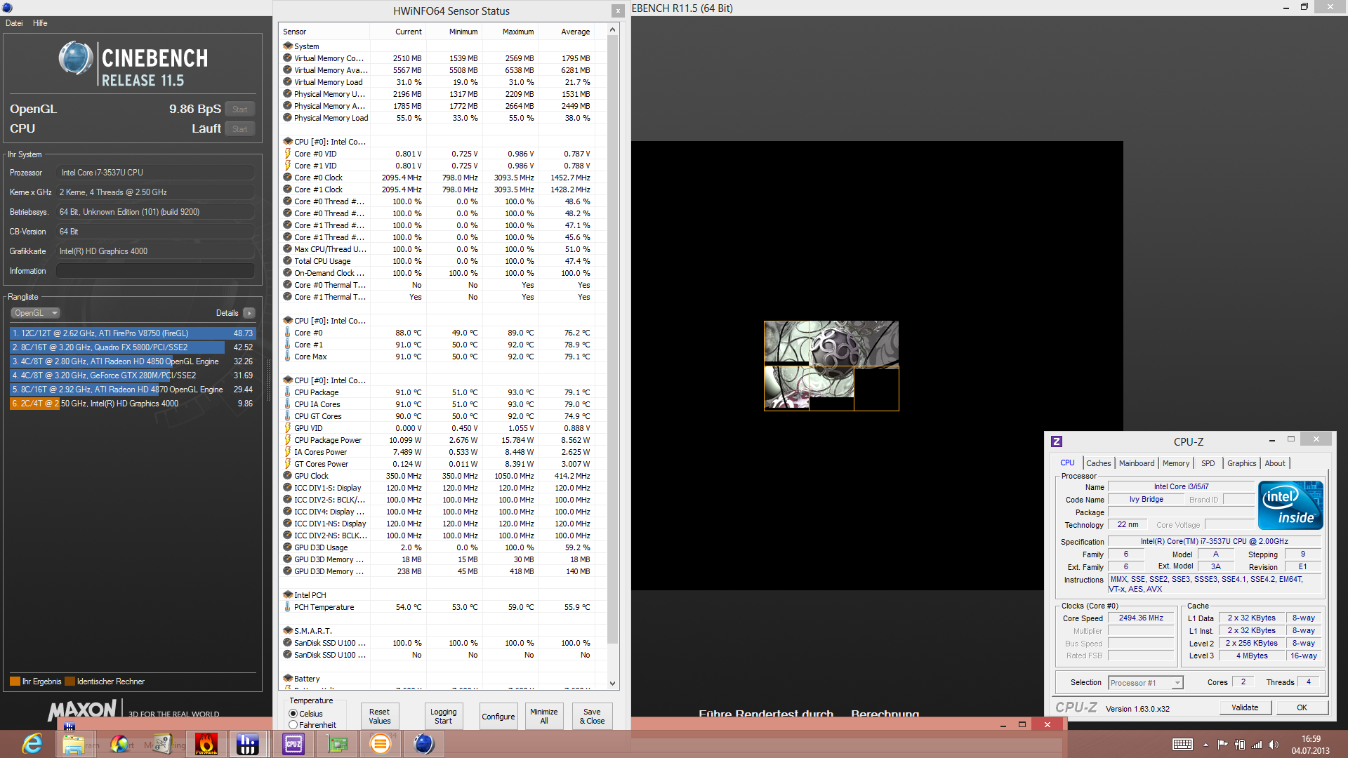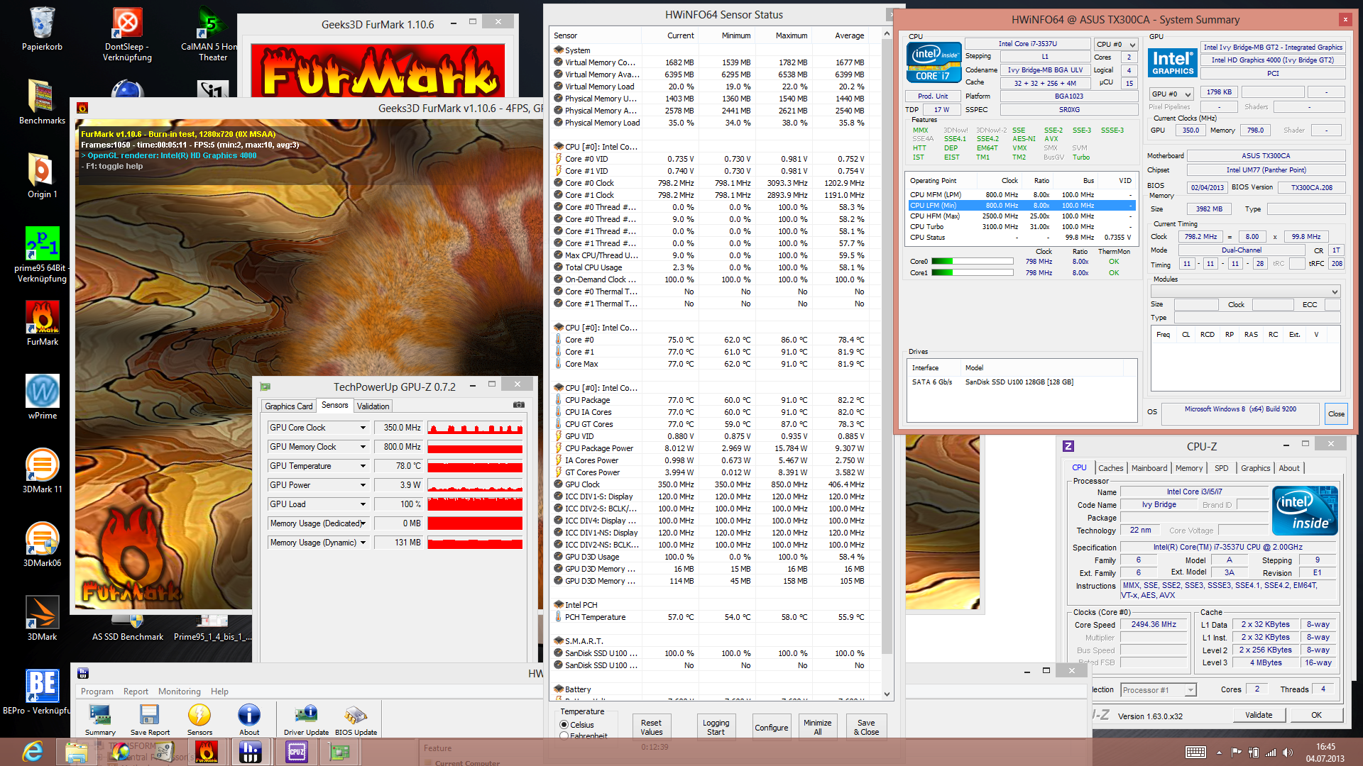 Der Stresstest macht das Dilemma sichtbar, denn er belastet GPU und CPU gleichermaßen für wenigstens zwei Stunden. Im nebenstehenden Screenshot sehen Sie: Das CPU-Package (hier ist auch die HD 4000 eingebaut) erhitzt sich auf 90 Grad, was zur massiven Drosselung bei GPU (350 MHz, Grundtakt) und CPU (800 MHz) führt. Läuft nur ein Prime95 (CPU-Stress solo), dann steht der Takt bei 1,5 GHz (unter Basistakt von 2,0 GHz = Throttling). Der Furmark (GPU-Stress solo) macht bei 350 bis 650 MHz weiter. Das liegt fern der theoretisch möglichen 1.150 MHz.