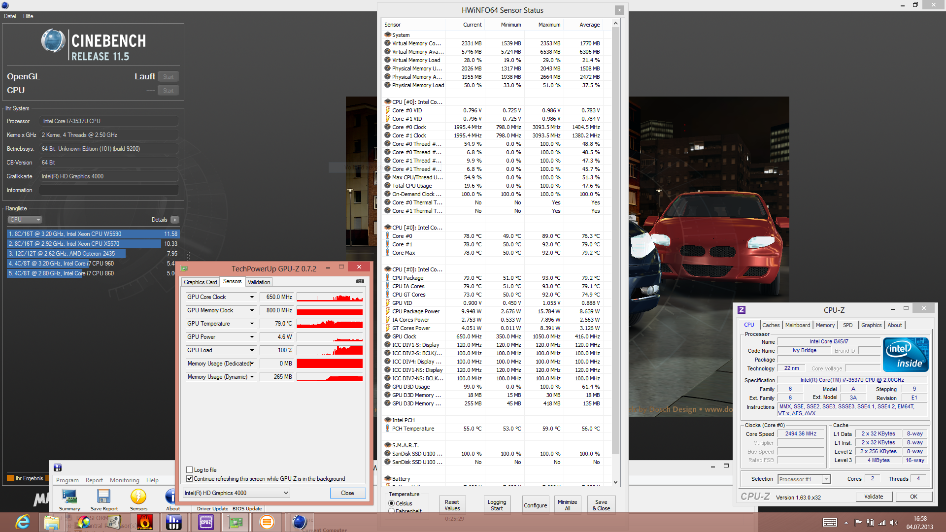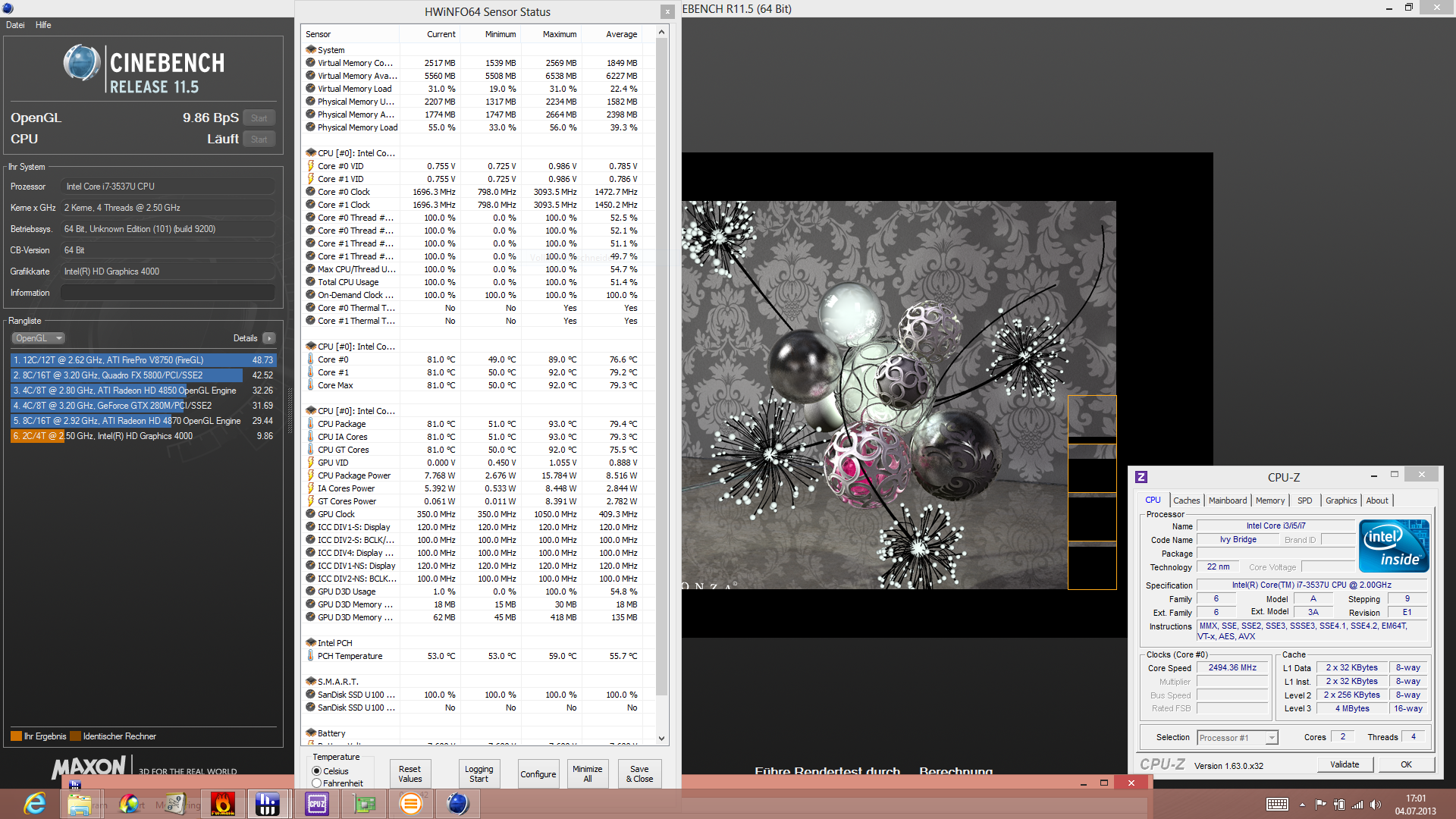 Der Core i7 3537U (2x 2,0 GHz) ist ein Ultra-Low-Voltage-Prozessor mit einem TDP von 17 Watt. Die Taktung per Turbo Boost 2.0 kann bis zu 3,1 GHz betragen (Single-Core-Last), wobei die Thermik mitspielen muss. Genau das prüfen wir mit dem Cinebench R11.5 unter Single- und Multi-Core-Last. Das Maximum der theoretischen Taktung wird weder zu Beginn noch am Ende des Benchmarks ausgeführt: 2,5 GHz liegen aber deutlich über dem Standard-Takt (kein Throttling).