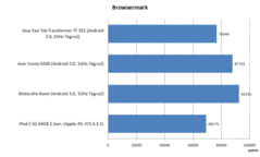 Subjektiv würde man im direkten Vergleich auf jeden Fall das iPad als leistungsfähiger einstufen, das wie zuvor beschrieben schon allein aufgrund des geschmeidigeren Interface dem User vermittelt wird. Schließlich liegt es aber in jedem Fall an der Software, wie gut die gebotenen Leistungsreserven ausgeschöpft werden können. Einen Plattform-übergreifenden Vergleich ermöglichen etwa diverse Browser-Benchmarks, die wir wie folgt durchgeführt haben (jeweils bestes Ergebnis aus zwei Durchläufen). Bedenken sollte man jedoch auch den Einfluss des Webbrowsers, wobei jedoch Googles Browser und Safari beide auf die Webkit Rendering Engine basieren.