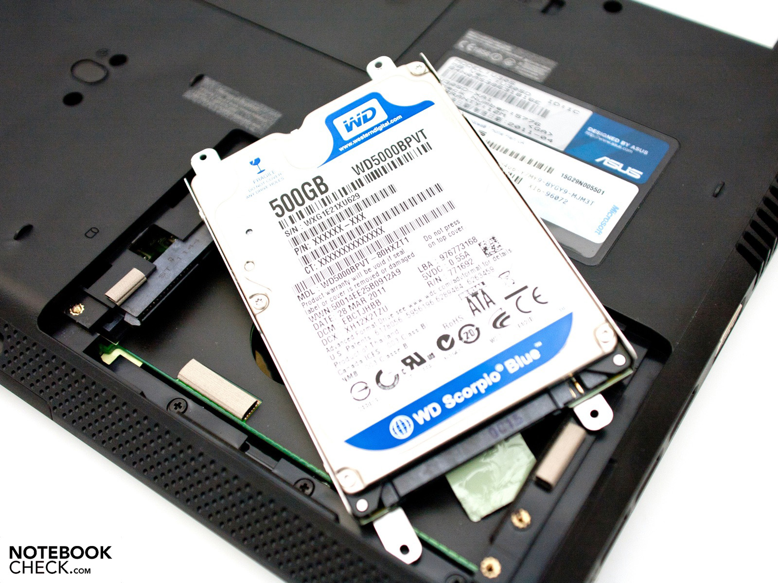 Als Speichermedium ist im Asus U30SD eine 2,5-Zoll-Festplatte mit einer Bruttokapazität von 500 GByte integriert. Die Western Digital Scorpio Blue vom Typ WD5000BPVT-80HXZ arbeitet dabei mit 5400 Umdrehungen und wird über einen SATA II Connector angesprochen. Ähnlich Einsteiger-HDDs mit 160, 250 oder 320 GByte liegt die maximale Lese-Übertragung mit 70,8 MByte pro Sekunde im Durchschnitt. Ein kleines Leistungsplus können Festplatten mit 7200 U/Min bringen, wobei die Zugriffszeiten nahezu unverändert bleiben. Aufgrund der aktuellen Technik empfehlen sich moderne Solid State Drives, wie beispielsweise die Intel SSD Serie 510 oder OCZ Vertex 3, mit SATA III Anbindung.