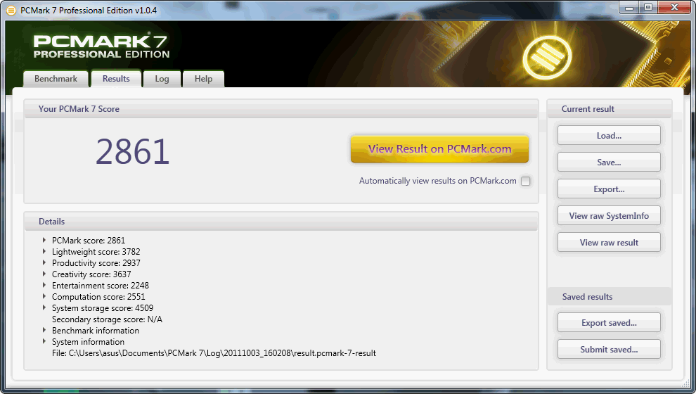 Der neue PCMark 7, welcher GPU-Leistung stärker einfließen lässt, kommt auf 2.861 Punkte. Da kann ein Packard Bell NX69 mit gleicher CPU aber starker GT 540M nicht mithalten: 1.849 Punkte. Der entscheidende Vorteil für den U36SD liegt im Storage Score von 4.509 Punkten. Das NX69 (HDD) schafft nur 1.349 Punkte. 1.470 Punkte sind es beispielsweise beim Asus K53TA (HDD) oder 1.509 Punkte beim LG A520 (HDD).