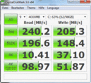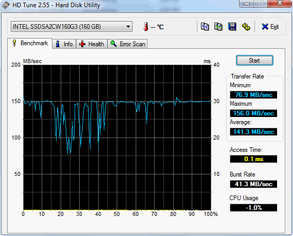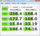 Die Messwerte des CrystalDiskMark 3.0 (Lesen 258 MB/s), des HD-Tune (Lesen 141 MB/s) und des AS SSD Benchmarks (Lesen 260 MB/s) sprechen für die Intel SSD 320 Series (160 GB, Typ: MLC, SATA am 3GB/s Port). Die Stärke der SSD liegt typischerweise im Lesen/Schreiben verstreuter Blöcke. Dies ist sogar eine besondere Stärke der 320er, wie CDM und AS SSD bescheinigen. Die SSD eines Samsung Series 9 900X3A (mSATA am 3GB/s Port) lag beim Lesen kleiner Blöcke zurück (CDM 4K: 10 versus 16 MB/s). AS SSD nennt den Grund: eine kürzere Zugriffszeit (0.164 vs. 0.301 Millisekunden). Beim Schreiben relativiert sich der Vorteil jedoch wieder.