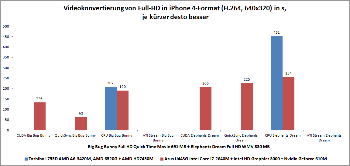 Zum Test der Videokonvertierungsfähigkeiten haben wir zwei verschiedene Full-HD-Videodateien (WMV und Quicktime) in ein iPhone kompatibles H.264-Format (640 x 320) umgewandelt und die Ergebnisse gegenübergestellt. Genutzt haben wir dazu Cyberlinks Media Espresso 6.5, das grundsätzlich alle 4 Möglichkeiten zur Konvertierung unterstützt: die reine CPU-Konvertierung, Intel QuickSync, Nvidia CUDA und AMD Stream. Bei unserem Testgerät kann man dank Nvidia Optimus gleich auf drei der vier Möglichkeiten zurückgreifen. Kaum konkurrenzfähig ist wie gehabt die reine CPU-Konvertierung, die je nach Aufgabe bis zu dreimal so lange arbeitet. Hier konvertieren die Grafiklösungen deutlich schneller und belasten das System zudem merklich weniger. QuickSync belastet das System mit 28-58 % CPU-Auslastung, CUDA mit 7-42 %, und die reine CPU-Konvertierung liegt immer über 90 % CPU-Last. QuickSync ist bei der Konvertierung des Quicktime Movies konkurrenzlos schnell, Nvidia kann dagegen beim WMV-Video einen kleinen Vorteil verbuchen.