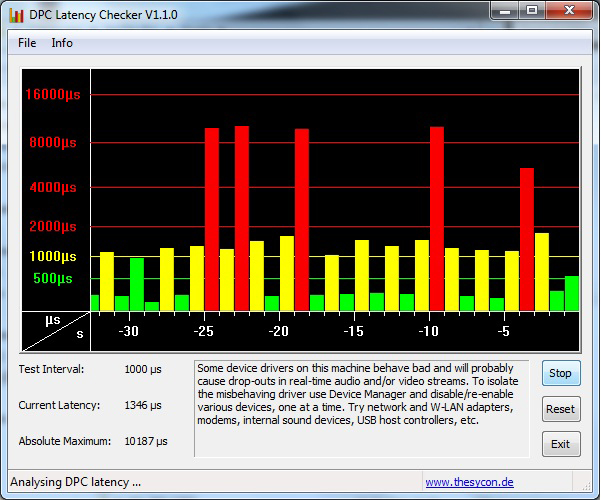 Mit dem DPC Latency Checker überprüfen wir das Auftreten möglicher Latenzen bei der Verwendung externer Geräte, die auf eine möglichst genaue Synchronisierung angewiesen sind. In diesem Punkt kann das Testsample nicht überzeugen. Mit eingeschalteten Funkmodulen werden jede Menge kritische Ausschläge angezeigt. Auch wenn die Funkmodule und der Netzwerkadapter deaktiviert sind, tritt nur eine geringe Verbesserung ein. Hier müssen Interessenten also auf detaillierte Fehlersuche gehen, um mit alternativen Treiberversionen eventuell eine Besserung zu erzielen.