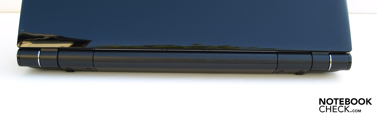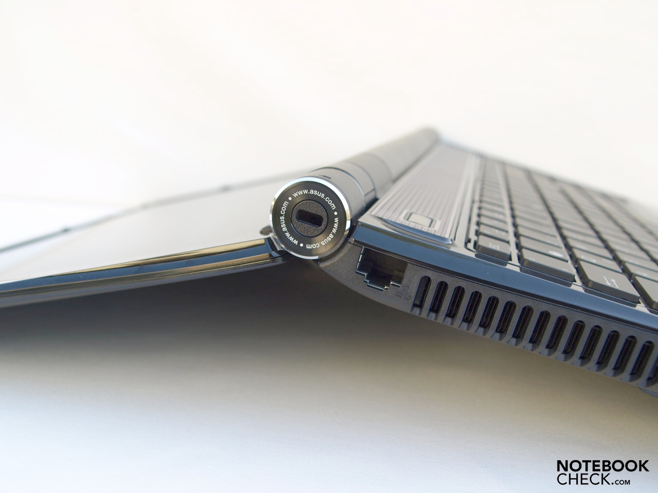 Die zylindrische Gestaltung der Scharniere erinnert stark an bereits getestete Sony Vaio Notebooks, oder eventuell an den Körper des Schmetterlings, an welchem die beiden Flügel, Display und Baseunit befestigt sind. Sie sind weder stark genug eine Nachwippen nach Einstellung des Öffnungswinkels zu verhindern, noch können sie jede beliebige Position ausreichend unterstützen. So kann ein Anheben des geöffneten Notebooks je nach Öffnungswinkel und angewandtem Schwung unter Umständen zu einem vollständigen Aufklappen des Notebooks führen. Apropos Öffnungswinkel: Es sind mehr als 180 Grad möglich. Beim Unterschreiten eines bestimmten Öffnungswinkels schließt sich das Notebook von selbst. Wohl aus Designgründen wurde ein Transportverschluss eingespart. Daher ist es empfehlenswert des Notebook beim Transport etwa in einer eigenen Hülle vor dem Eindringen von Fremdkörpern in den Zwischenraum zwischen Tastatur und Bildschirm zu schützen.