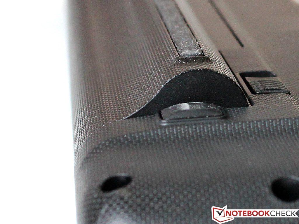 Auch die Angabe der Gehäusedicke von einem Zoll, umgerechnet also gut 2,5 Zentimetern, gilt nur mit Einschränkungen. Der voluminöse 74-Wh-Akku ragt nach unten aus dem Chassis heraus und hebt das Notebook an der Rückseite um mehr als einen Zentimeter an. In Verbindung mit einem Gewicht von etwa 2,5 Kilogramm schränkt dies die auf den ersten Blick hohe Mobilität doch merklich ein.