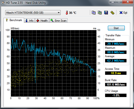 Höchstleistungen bei den Übertragungsraten lassen diese Daten nicht erwarten. Ein Benchmark mit dem Programm HD Tune offenbarte eine durchschnittliche Lesegeschwindigkeit von 62,2 MB/s, womit sich der Datenträger nur im unteren Mittelfeld platzieren kann. Mit knapp 70 MB/s schneller agiert die Samsung HM321HI des E3520, noch deutlich bessere Werte liefern Festplatten mit 7200 U/min, wie beispielsweise im HP ProBook 4530s.