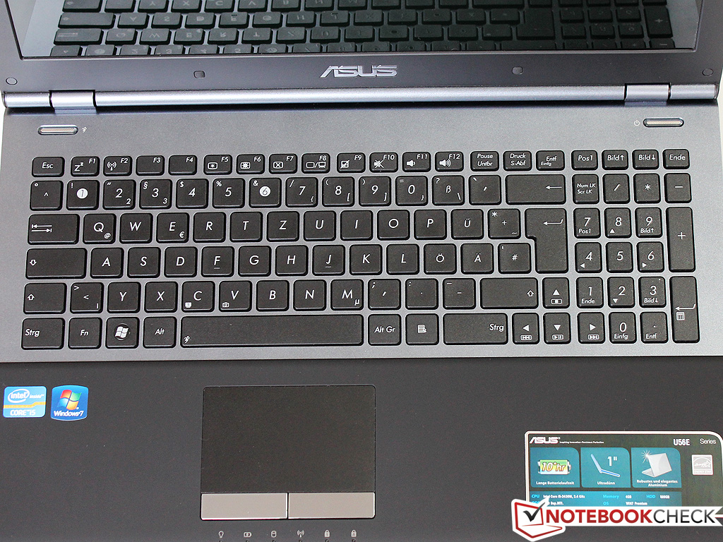 Hochwertige Eingabegeräte, dabei insbesondere die Tastatur, gehören zu den wichtigsten Eigenschaften eines guten Office-Notebooks. Das U56E setzt dabei auf das im aktuellen Trend liegende Chiclet-Design, welches trotz der schicken Optik wohl nicht den Geschmack jedes Käufers treffen wird. Die schwarzen Tasten mit einer Größe von 15 x 15 Millimetern wurden auf der Oberseite leicht strukturiert, sind durch ihre komplett ebene Fläche aber dennoch erst nach kurzer Eingewöhnung sicher zu treffen. Lobenswert: Layout und Abmaße der Funktionstasten unterscheiden sich kaum von gewöhnlichen Desktop-Tastaturen, ferner wurde ein vollständiger Ziffernblock integriert.