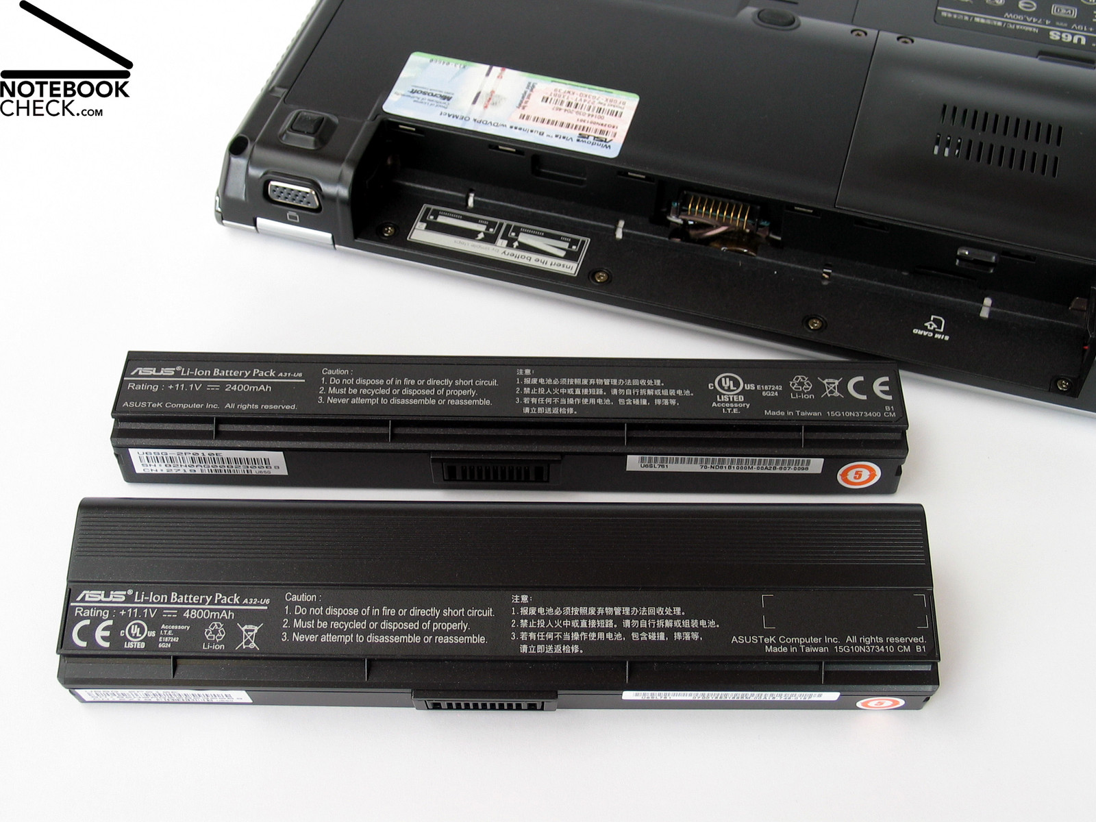 Zwei verschiedene Akkupacks liefert Asus zusammen mit den U6S. Einen Kleinen, der optimal auf die Abmessungen des Notebooks zugeschnitten ist und auch mit einer Lederoberfläche versehen wurde, sowie einen Größeren der jedoch deutlich hinten aus dem Gehäuse übersteht und darüber hinaus ein Mehrgewicht von 150 Gramm verursacht.
