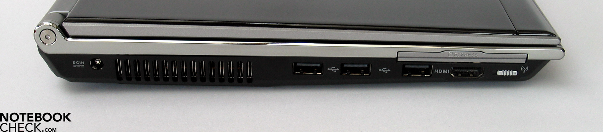 Würde man nun bei der Aufzählung der angebotenen Ports stoppen, so hätte man durchaus schon eine brauchbare Anschlussausstattung erreicht, die speziell in der kompakten 12.1 Zoll Subnotebook Klasse auch nicht sonderlich ungewöhnlich wäre. Mit Ausnahme des Netzanschlusses natürlich, dieser folgt an der linken Gehäuseseite im hinteren Bereich. Nach kurzer Unterbrechung durch den Auslass des Systemlüfters folgen drei weitere USB Ports womit wir bereits bei insgesamt vier Stück schnellen USB 2.0 Anschlüssen angelangt wären. Gekrönt wird das Schnittstellenangebot durch einen HDMI Port, unterhalb des ExpressCard Slots gelegen, der den digitalen Anschluss externer Monitore oder TV Geräte ermöglicht. Damit wären die angebotenen Ports komplett und das Asus U6S beinahe schon in die Multimediaklasse gehievt, wo vergleichbare Ausstattungen eher zu finden sind als im kompakten 12 Zoll Segment.