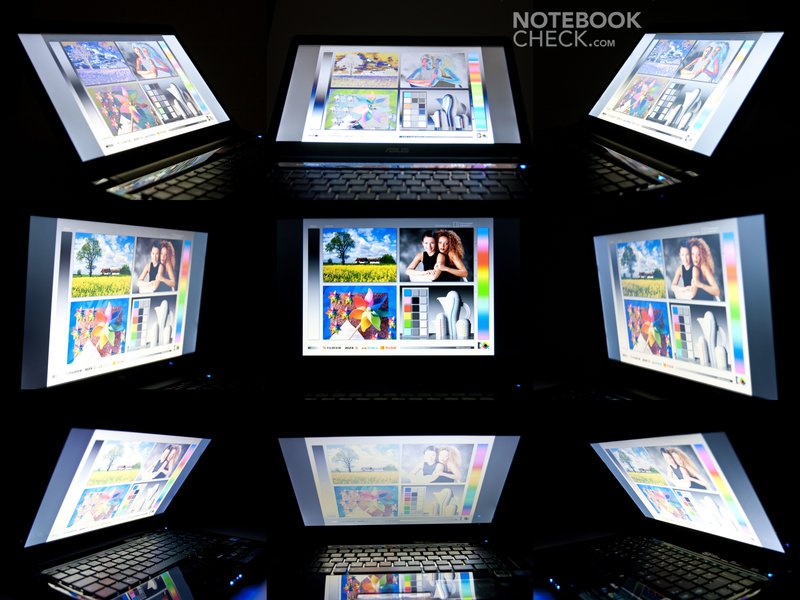 Das UL80Vt ist mit einem 14,0-Zoll-HD-Bildschirm mit LED-Hintergrundbeleuchtung ausgestattet, der eine maximale Auflösung von 1366x768 Pixel bietet. Der Bildschirm unseres Testgerätes ist hochglänzend ausgeführt. Die gesamte UL80-Modellreihe ist mit vergleichbaren Bildschirmen ausgestattet. Asus bietet allerdings das größere UL50Vt-XO037V mit mattem Bildschirm an. Spiegelungen entstehen beim vorliegenden Gerät sowohl im ausgeschalteten als auch im eingeschalteten Zustand. Dafür bieten hochglänzende Bildschirme subjektiv die schöneren Farben. Mit einer nativen Auflösung von 1366x768 Pixel erfüllt der 14,0-Zoll-Bildschirm die HD-Ready-Anforderungen, wodurch schwarze Balken bei der Wiedergabe von Videomaterial minimiert werden.