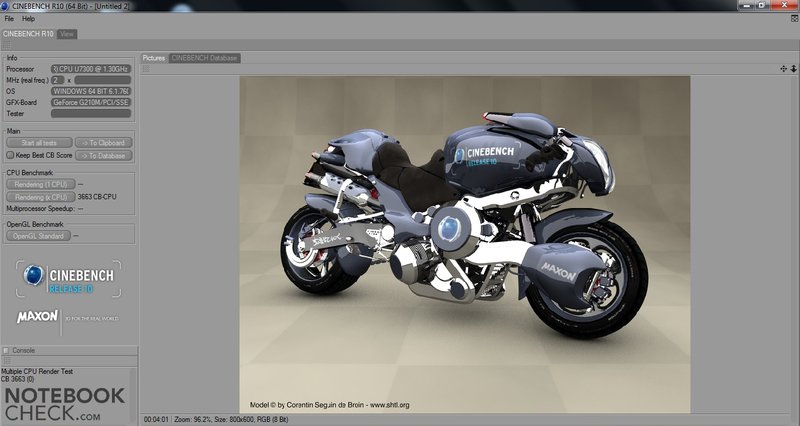 Der CPU-lastigen Cinebench R10 Benchmark verlief ohne Probleme. Im Singlecore-Rendering wurden 2034 Punkte und im Multicore-Rendering 3833 Punkte erreicht. Beim Open GL Shading waren es 2811 Punkte.