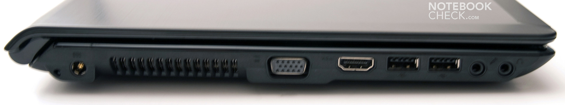 Ein solides Maß an Anschlussmöglichkeiten bekommt man vom UL80Vt geboten. An der linken Seite befinden sich zwei USB 2.0 Schnittstellen, ein analoger Videoausgang (VGA), ein digitaler Videoausgang (HDMI), der Stromanschluss sowie die Audioanschlüsse (Kopfhörerausgang, Mikrofoneingang). Die zwei verbauten USB-Anschlüsse liegen leider relativ nah beieinander, sodass es bei großen Steckern zu Platzproblemen kommen könnte.