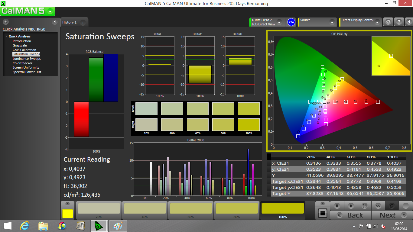 Vor unserer Kalibrierung liegen die DeltaE(2000)-Werte sowohl für die Graustufen als auch für die Farbsättigung im sehr hohen und damit schlechten Bereich von 6,63 und 6,33. Man geht davon aus, dass ein DeltaE(2000) von unter vier besagt, dass ein menschliches Auge fast keinen Unterschied zwischen dem sRGB Pattern und dem nativen Pattern bezüglich der Farbkanten ausmachen kann. Das Asus liegt hier im Ausgangszustand deutlich darüber. Nach dem Kalibrieren werden dann aber ausgezeichnete Werte erreicht. Das DeltaE der Farbsättigung sinkt auf 2,57; das des Schwarzwertes sogar auf 1,79. Nun würden einzig der begrenzte Farbraum von nur 62 Prozent des sRGB sowie 44 Prozent des AdobeRGB Standards einen Einsatz im professionellen Foto- und Grafik-Bereich verhindern. Eine Kalibrierung ist also auch für den Heimgebrauch durchaus ratsam.
