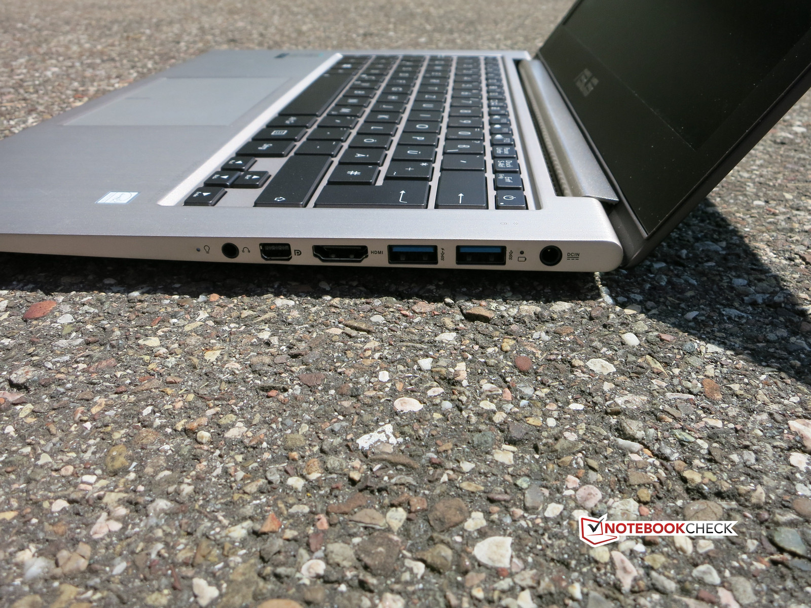 Sehr gut löst Asus die Anordnung der vorhandenen Schnittstellen und verteilt diese, durch den Anwender gut erreichbar, ausschließlich auf die Seiten des Notebooks mit einem Schwerpunkt auf rechts. Alle Anschlüsse befinden sich zudem, sicher auch bauformbedingt, im hinteren Drittel. Somit kommt es auch bei der Verwendung einer externen Maus nie zu Einschränkungen in der Bedienung aufgrund von Raumüberschneidungen. Leider sind die Abstände der Anschlüsse zueinander relativ knapp bemessen, sodass größere USB-Sticks bereits den Nachbar-Port abdecken könnten.