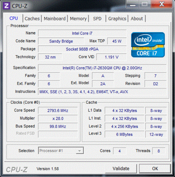 Sechs MByte L3-Cache und 995 Millionen Transistoren sind weitere Garanten für eine ausgezeichnete Leistungsfähigkeit. Der HD Graphics 3000 genannte Grafikchip ist beim VX7 übrigens nicht nutzbar, Asus setzt rein auf die dedizierte Nvidia-GPU. Wie alle anderen Sandy-Bridge-CPUs wird der Core i7-2630QM im modernen 32 nm Verfahren hergestellt, die Thermal Design Power beträgt 45 Watt (35 Watt bei den "normalen" Dual-Cores).