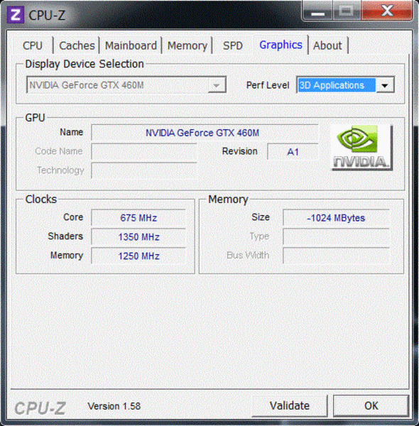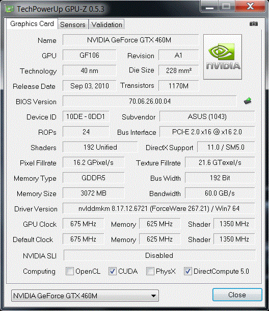 Die Daten der GeForce GTX 460M können sich auch im Jahr 2011 noch sehen lassen. Angefangen beim 1536 MByte großen GDDR5-Videospeicher (1250 MHz), der über ein 192 Bit breites Interface verfügt. Die Shaderanzahl ist mit 192 ebenfalls nicht von schlechten Eltern. Im Vergleich zum Nachfolger GTX 560M sind die Taktraten etwas niedriger, statt 775/1550 MHz taktet die GTX 460M „nur“ mit 675/1350 MHz (Kern/Shader).