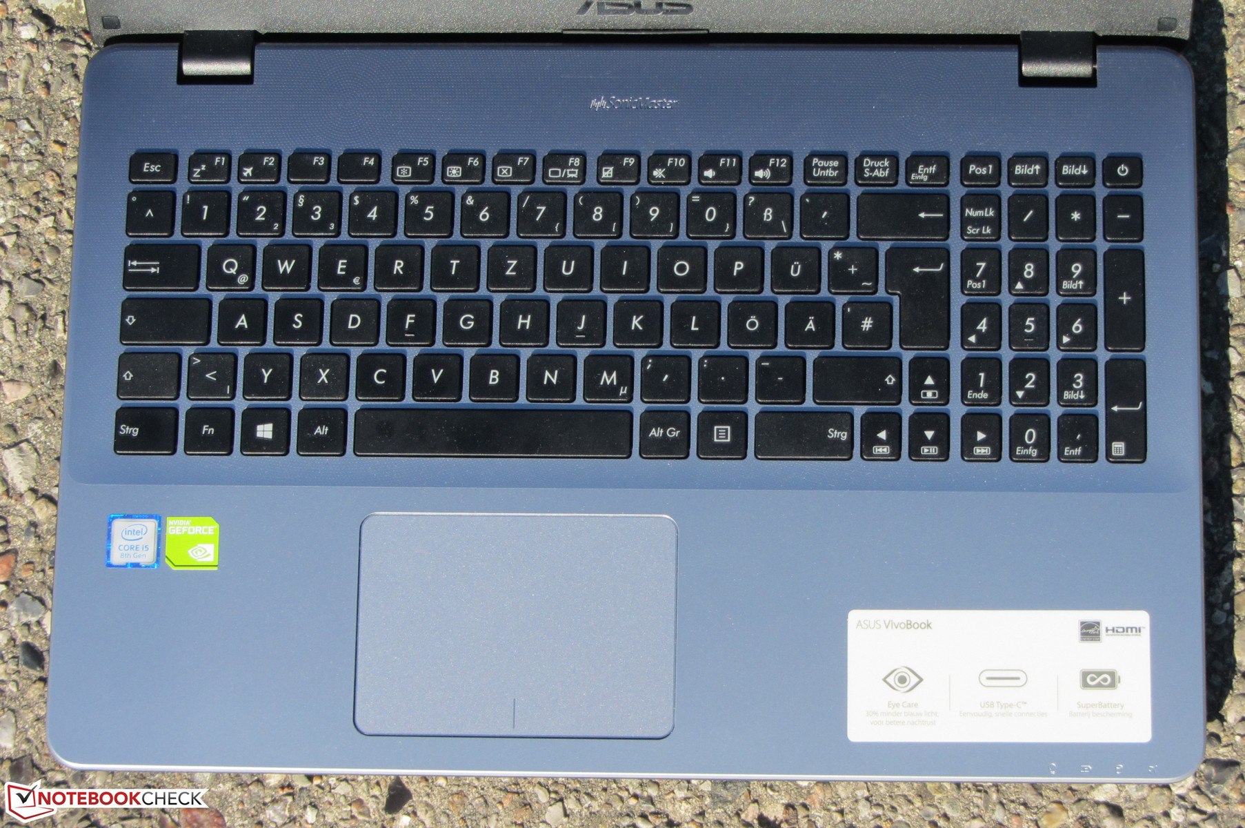 Asus stattet das Vivobook mit einer unbeleuchteten Chiclet-Tastatur aus, die einen Nummernblock mitbringt. Die flachen, leicht angerauten Tasten verfügen über einen mittleren Hub und einen klaren Druckpunkt. Der Tastenwiderstand geht in Ordnung, dürfte für unseren Geschmack aber noch etwas knackiger ausfallen. Während des Tippens gibt die Tastatur etwas nach. Als übermäßig störend hat sich das nicht erwiesen. Alles in allem liefert Asus hier eine ordentliche Tastatur, die die Anforderungen an den Hausgebrauch erfüllt.