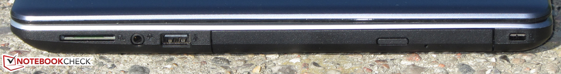 Der Rechner wartet mit einer stimmigen Schnittstellenbestückung auf. Vier USB-Steckplätze bringt das Vivobook mit. Drei der Steckplätze (2x Typ A, 1x Typ C) arbeiten nach dem USB-3.1-Gen-1-Standard, einer nach dem USB-2.0-Standard (Typ A). Zwei Videoausgänge (HDMI, VGA) sind vorhanden. Der verbaute Speicherkartenleser lässt es ruhig angehen. Beim Kopieren großer Datenblöcke wird eine maximale Transferrate von 31,1 MB/s erreicht. Die Übertragung von 250 JPG-Bilddateien (je rund 5 MB) wird mit einer Geschwindigkeit von 34,3 MB/s absolviert. Wir testen Speicherkartenleser mittels einer Referenzkarte (Toshiba Exceria Pro SDXC 64 GB UHS-II).