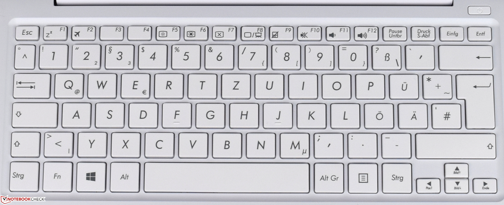 Die Chiclet-Tastatur des Asus VivoBook E200HA ist etwas vertieft in die Oberseite der Base eingearbeitet, sodass sich die Tasten auf einer Höhe mit der Handballenauflage befinden. Mit 15 x 15 Millimetern sind die Tasten ausreichend groß und die Beschriftung lässt sich gut ablesen. Farblich sind die Tasten identisch mit der Gehäusefarbe, was bei den beiden anderen Modellen in Blau und Gold nicht der Fall ist. Diese stattet Asus mit schwarzen Tasten und einer weißen Aufschrift aus. Jedoch hat leider keines eine Hintergrundbeleuchtung, welche das Arbeiten bei ungünstigen Lichtverhältnissen erleichtern würde. Der Tastenhub ist mit 1,6 Millimetern nicht zu hoch, wenngleich der Druckpunkt etwas schwammig wirkt. Insgesamt macht die Tastatur einen guten Eindruck und die Geräuschkulisse beim Tippen ist nicht störend.