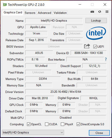 Intels HD Graphics 505 Grafikkern ist für die Grafikausgabe zuständig. Die GPU unterstützt DirectX 12 und arbeitet mit Geschwindigkeiten von bis zu 750 MHz. Die Resultate in den 3D-Mark-Benchmarks bewegen sich auf einem normalen Niveau für die GPU. Der in die GPU integrierte Decoder kann den Prozessor bei der Wiedergabe von Videos in gängigen Formaten wie H.264, VP9 und HEVC/H.265 entlasten.