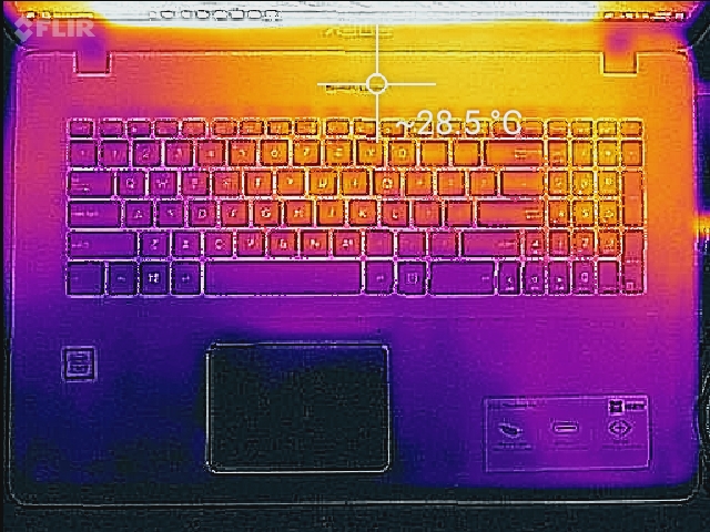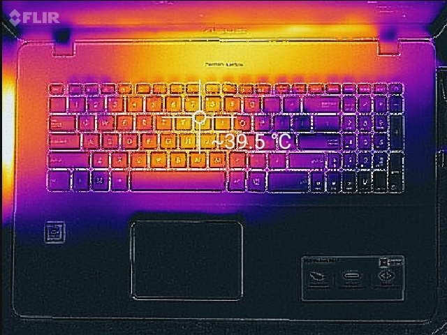 Bei einem Punkt hat sich das VivoBook Pro 17 im Vergleich zu dem im Oktober getesteten Modell deutlich verschlechtert: Den Oberflächentemperaturen. Obwohl die Temperaturen im Idle bei 26,1 °C/30 °C (oben/unten) noch sehr angenehm sind, wird es unter Last etwas ungemütlich, und das Gerät erreicht durchschnittliche Temperaturen von 34,3 °C und 41,3 °C. Wir stellten auf der Oberseite oben in der Mitte einen Hotspot von 46 °C fest, sowie 43,6 °C in der Mitte der Tastatur (was bei deren Verwendung recht störend ist). Das größte Problem war aber auf der Unterseite des Geräts zu finden. Hier wurden mehrere Hotspots von über 50 °C gemessen, sowie einer, wieder oben in der Mitte, von 56,2 °C. Diese Temperaturen machen es mehr oder weniger unmöglich, das Gerät auf dem Schoß zu verwenden, wenn es unter großer Last ist. Stellen Sie sicher, dass das Gerät auf einer festen Oberfläche steht, dann sollten Sie keine weiteren Probleme damit haben.