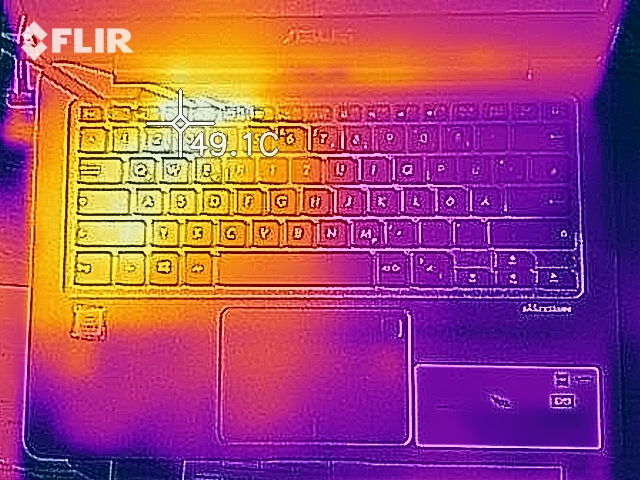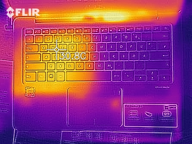 (+) Die Handballen und der Touchpad-Bereich sind mit gemessenen 27.8 °C kühler als die typische Hauttemperatur und fühlen sich dadurch kühl an.