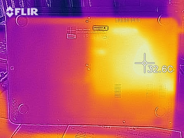Sonderlich stark erwärmt sich das Notebook nicht. Während des Stresstests wird nur an einem Messpunkt knapp die 40-Grad-Celsius-Marke überschritten.