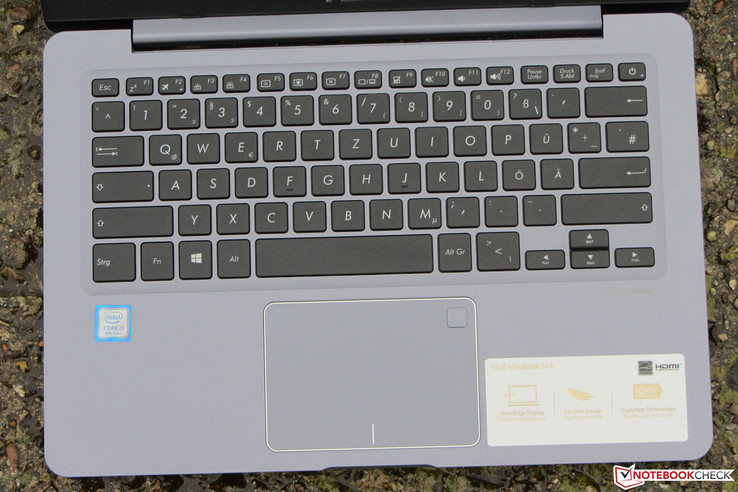 Asus stattet das Vivobook mit einer beleuchteten Chiclet-Tastatur aus. Die glatten Tasten verfügen über einen kurzen Hub und einen klaren Druckpunkt. Für unseren Geschmack dürfte der Tastenwiderstand etwas knackiger ausfallen. Während des Tippens gibt die Tastatur etwas nach - in der Mitte stärker als an den Außenseiten. Alles in allem liefert Asus hier eine ordentliche Tastatur, die auch die Erledigung regelmäßiger Schreibarbeiten erlaubt. Zu den Spitzenmodellen unter den Tastaturen zählt sie nicht.