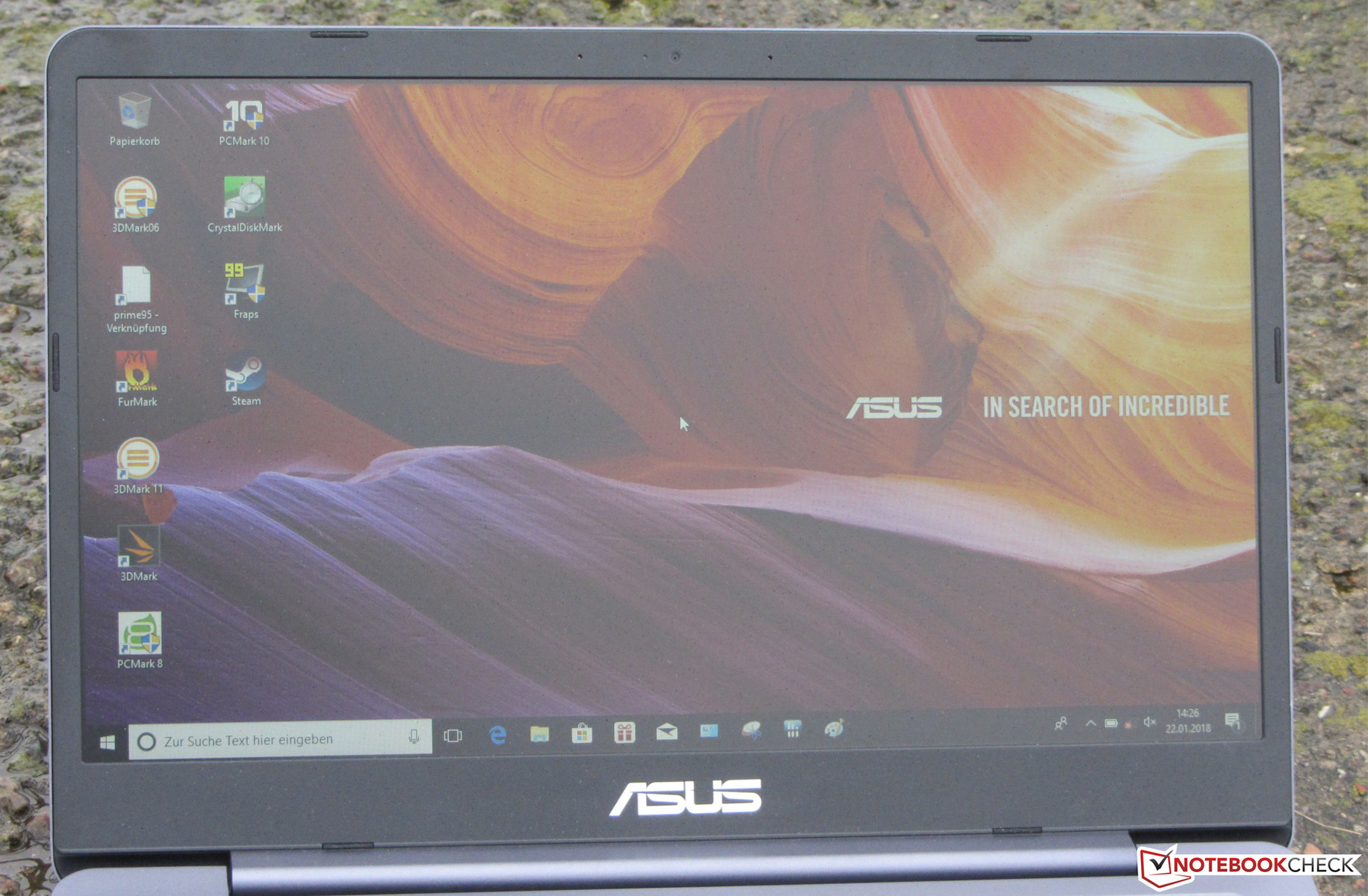 Der Bildschirm stellt einen weiteren Schwachpunkt des Rechners dar. Asus hat sich für ein dunkles, kontrastarmes, blickwinkelinstabiles HD-Modell entschieden. Dieses Display ist einem 900-Euro-Notebook unangemessen. Ein heller, kontrastreicher IPS-Bildschirm wäre bei diesem Preisniveau Pflicht gewesen.