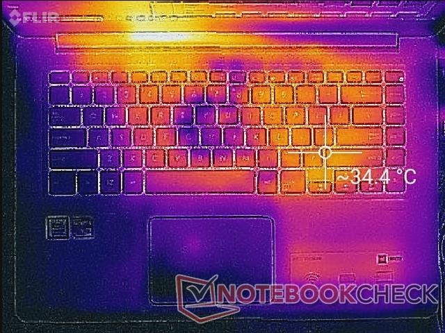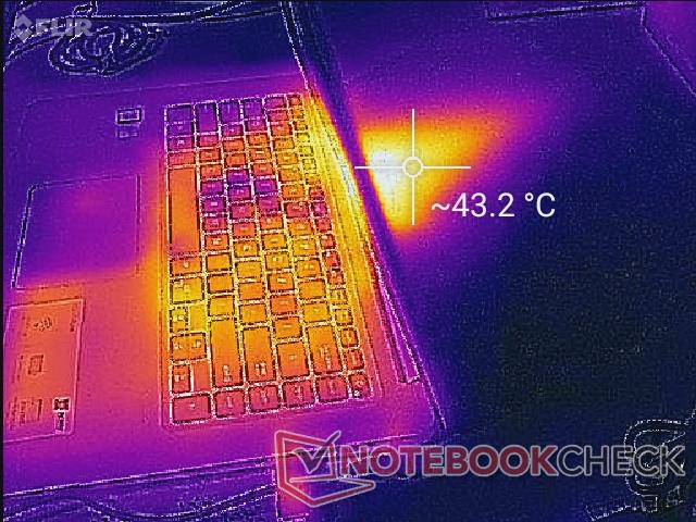 Die Oberflächentemperaturen sind grundsätzlich auf der linken Seite des Notebooks geringer als auf der rechten. Dieser Asymmetrie liegt die Positionierung der Festplatte und der Heat Pipe zugrunde. Glücklicherweise sind die Temperaturen in der Umgebung der Handballenauflage und der Tastatur niemals unangenehm heiß, egal bei welcher Last.