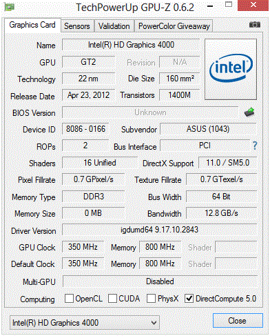 Die Grafikaufgaben übernimmt die im Prozessor integrierte Intel HD Graphics 4000. Durch die Vereinigung von CPU und GPU auf einem Chip kann der Strombedarf gesenkt werden. Allerdings ist diese Lösung nicht sehr leistungsstark, weshalb auf anspruchsvolle Computerspiele verzichtet werden muss. Außerdem hängt die Leistungsfähigkeit von der Stärke des Prozessors ab, weshalb die Benchmarks dieses Systems aufgrund des stromsparenden ULV-Prozessors hinter dem Durchschnitt zurückbleiben.