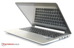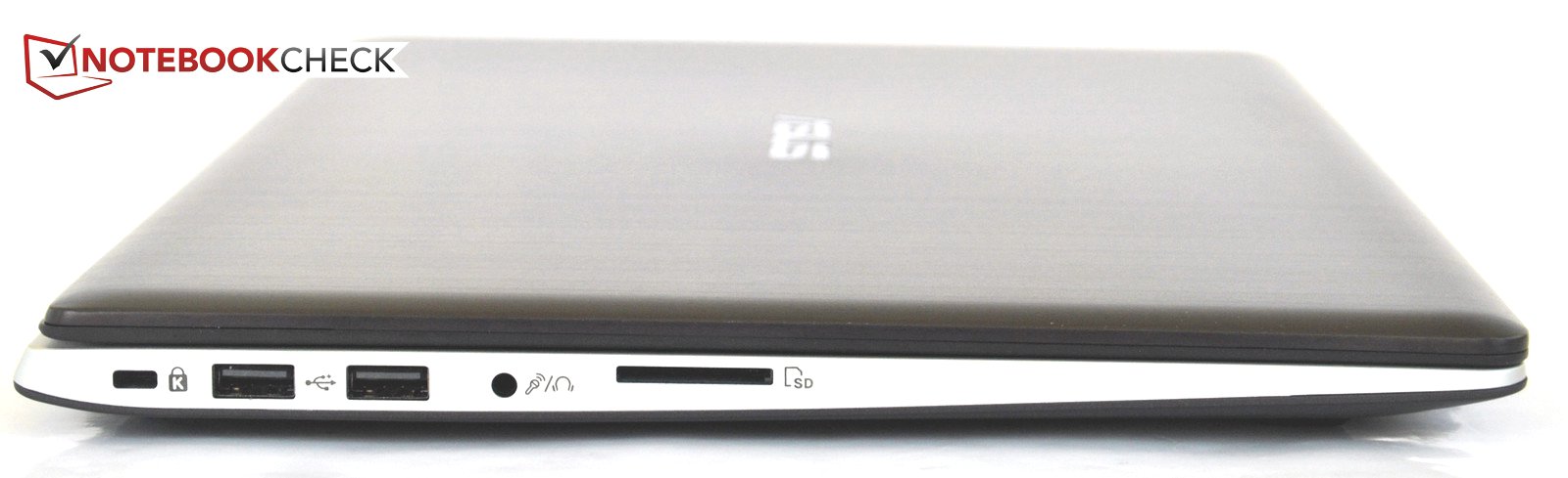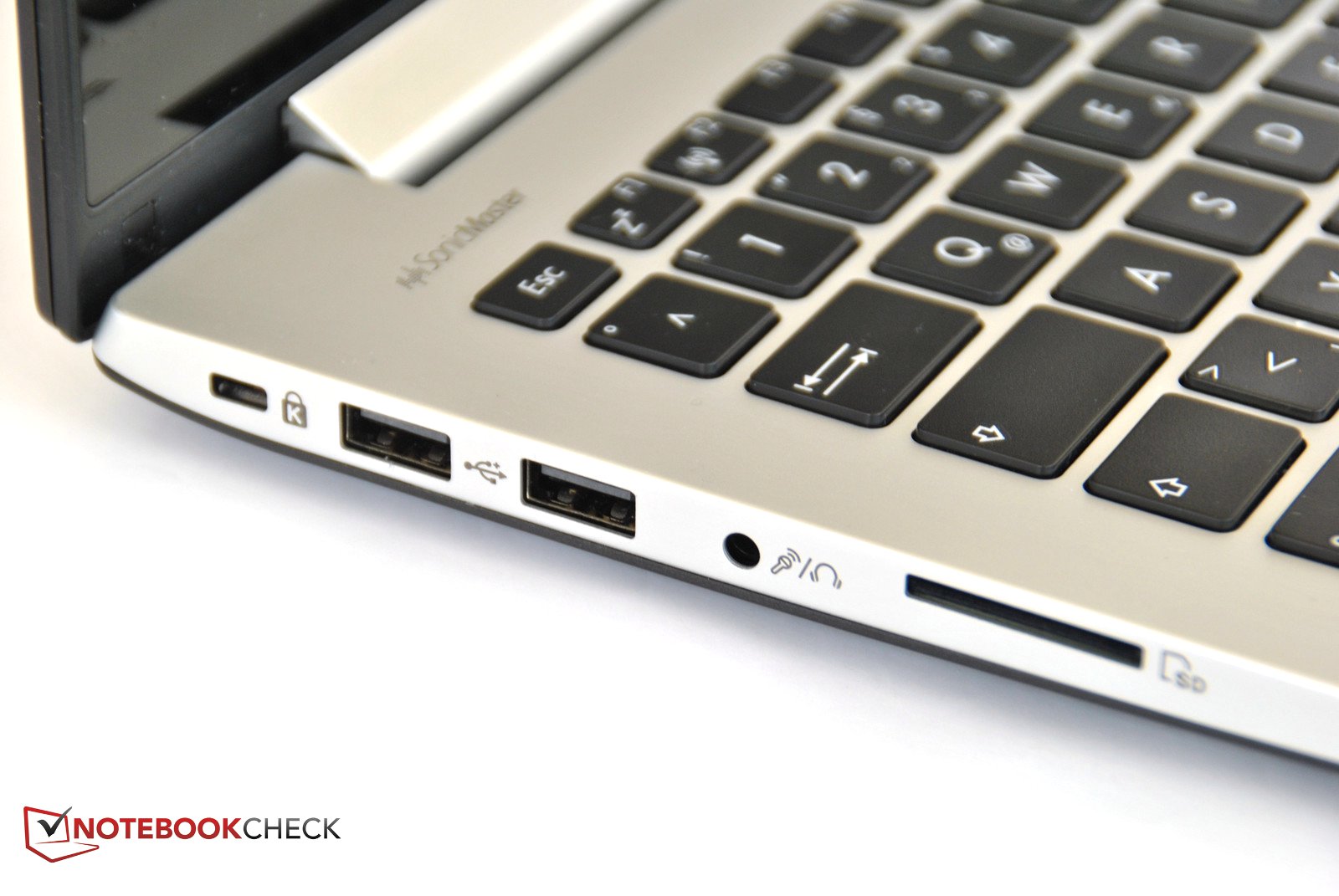 Auf der linken Seite sind zwei USB-2.0-Schnittstellen zwischen Kensington-Schloss und Kopfhörer/Mikrofon-Kombi platziert. Davor befindet sich ein SD-Kartenleser. Die Schnittstellen sind auf beiden Seiten aufgrund des sich nach vorne verjüngendem Gehäuses möglichst weit nach hinten gelegt worden. Somit kann man neben dem Notebook auch mit einer externen Maus arbeiten. Es ist allerdings nicht mehr zeitgemäß, dass nur eine USB-3.0-Buchse verwendet wird.