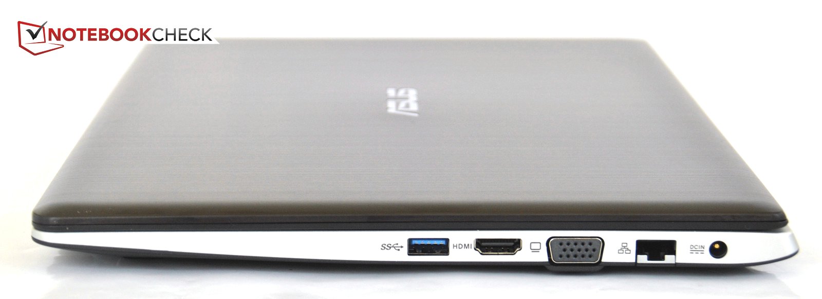 Die Anschlüsse des VivoBooks sind auf die beiden Seiten verteilt. Vorne befinden sich nur die Status-LEDs und die Rückseite ist völlig frei von jedweden Buchsen. Rechts findet man die Bildschirmschnittstellen VGA und HDMI, außerdem wurden der Stromanschluss und die einzige USB-3.0-Buchse auf diese Seite gelegt. Die Ethernet-Buchse ist zum Aufklappen und passt somit in das schlanke Gehäuse. Dadurch ist sie aber sehr wackelig und auch das Herausnehmen des Kabels ist nicht ganz einfach.