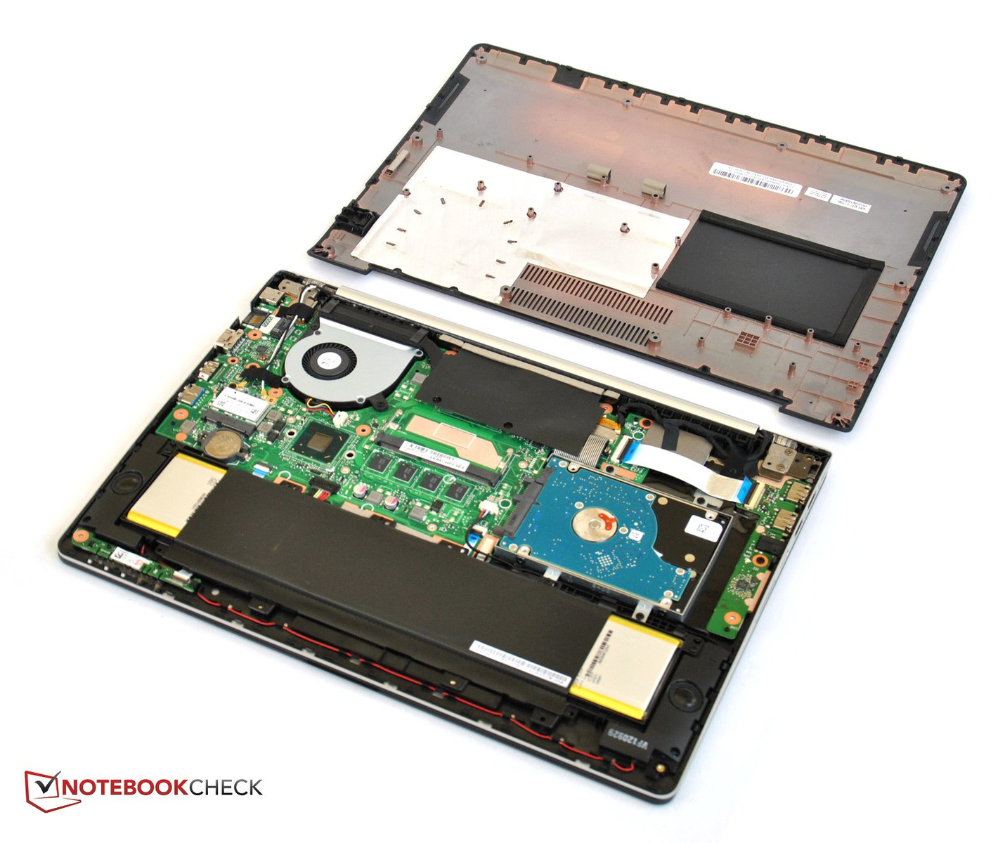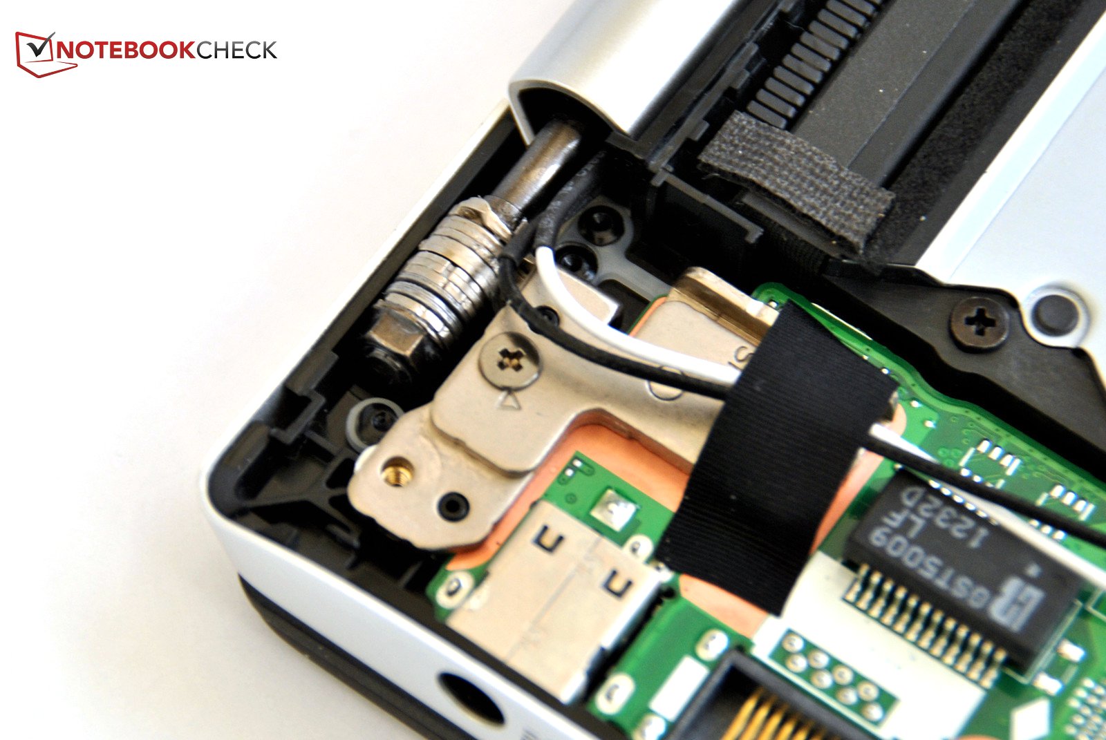 Um das Notebook zu modifizieren, benötigt man ein klein wenig Erfahrung, denn eine Wartungsklappe sucht man vergeblich. Hat man die zehn Schrauben entfernt, die die Base Unit sichern, nimmt man mit etwas Kraft die gesamte Unterseite ab. Darunter befindet sich die Festplatte, die sich nun leicht austauschen lässt. Auch einen freien RAM-Slot findet man vor. Damit kann man die fest verlöteten 4 GB Arbeitsspeicher aufrüsten. Hier hat man auch Zugriff auf den Akku und die WLAN-Karte.