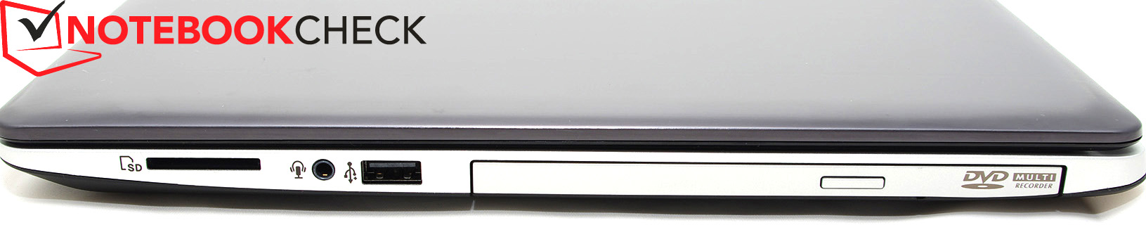 Bei den Verbindungsmöglichkeiten mit Peripheriegeräten hat sich seit dem VivoBook S550CM nur wenig getan: Aus 2x USB 2.0 und 1x USB 3.0 wurde bei unserem Testgerät 2x USB 3.0 und 1x USB 2.0. Dieser Umstand ist besser, jedoch noch nicht perfekt. In der heutigen Zeit wünschen wir uns ausschließlich High-Speed-Anschlüsse. Für so manchen User ein großer Vorteil ist jedoch das Hinzukommen eines optischen DVD-Laufwerks, mit dem das VivoBook die volle Multimedia-Unterstützung bekommt. Etwas verschlechtert hat sich jedoch die Verteilung der Anschlüsse. Waren diese beim Vorgänger im hinteren Bereich, müssen USB-2.0-Geräte bei unserem Sample nun vorne rechts angesteckt werden. Wer hier gerne eine Maus oder ähnliches anschließt, wird den Stecker mit seiner Hand oftmals berühren.