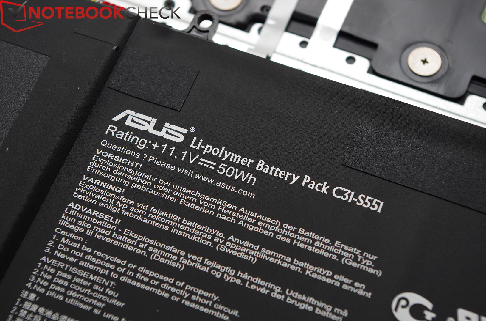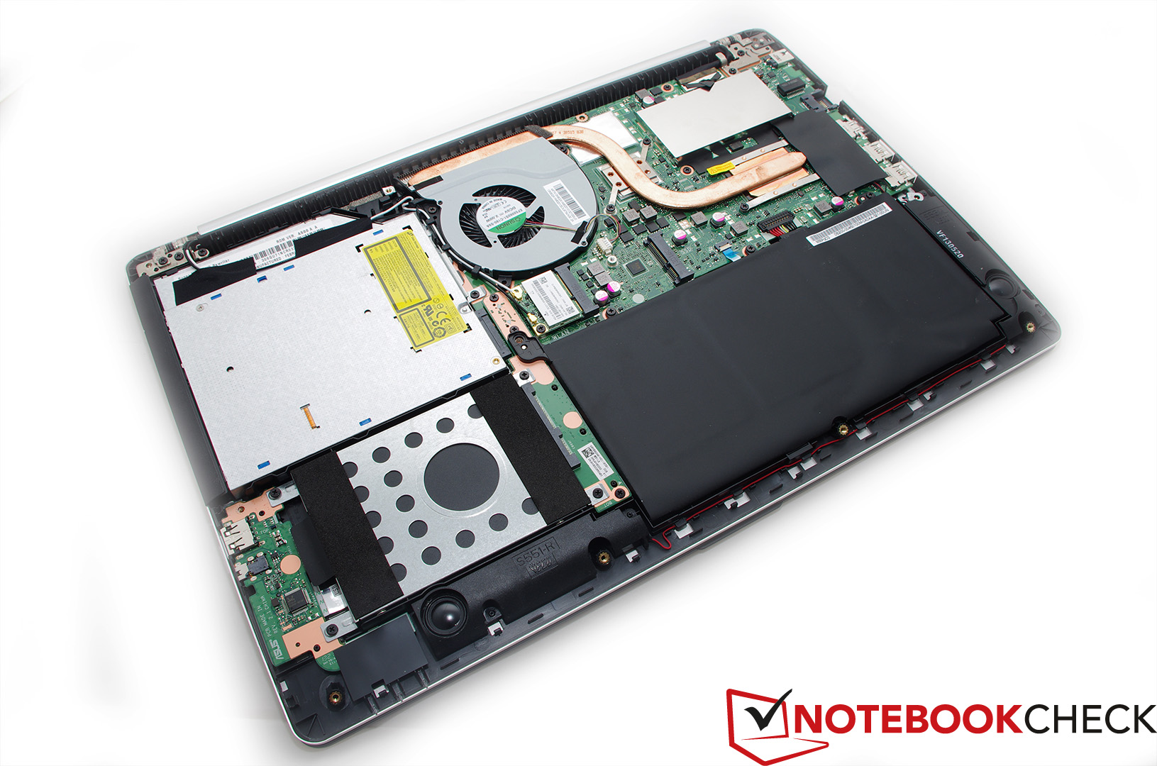 Um an das Innenleben des VivoBook S551LB heranzukommen, muss die gesamte Rückplatte des Notebooks entfernt werden. Diese wird von zahlreichen Schrauben festgehalten. Hat man das jedoch geschafft, so erhält man Zugriff auf die Festplatte, das Laufwerk und den Polymer-Akku, welcher bei einem Defekt problemlos ausgetauscht werden könnte. Der Arbeitsspeicher ist nicht frei zugänglich, sondern fest mit der Platine verlötet. Zusätzlich könnte noch eine mSATA-Schnittstelle direkt unter dem WLAN-Modul genutzt werden, um auf zusätzlichen schnelleren Speicher zurückgreifen zu können. Diese Möglichkeit konnten wir aufgrund fehlender Hardware jedoch nicht testen.