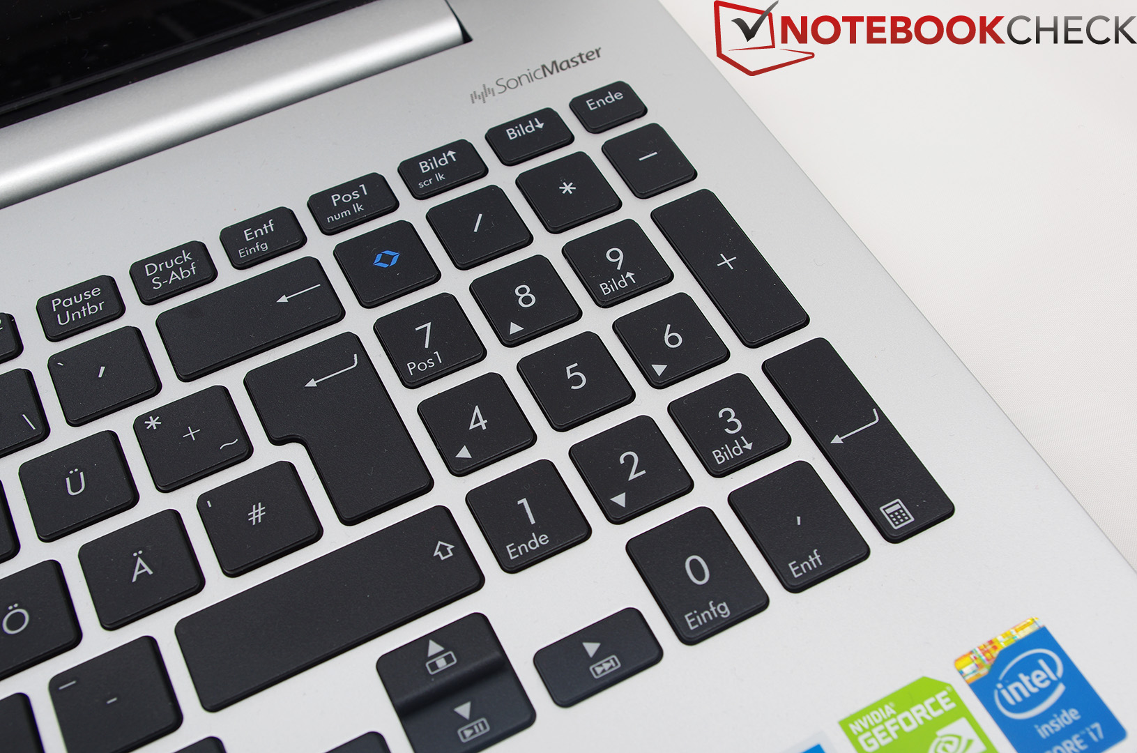 Ultrabooktypisch stattet Asus das S551LB mit kleinen, flachen und vor allem bei Benutzung sehr leisen Tasten aus. Im Vergleich zu seinen Vorgängern (S550CA und S550CM) hat sich jedoch nur wenig verändert. So wurden die Pfeiltasten anders angeordnet und verkleinert. Dadurch klafft zwischen diesen und dem Nummernfeld nur eine kleine Lücke, die von eben jenen Tasten ausgefüllt wurde. Hervorheben können wir aber die enorme Leichtigkeit, mit denen sich die Tasten bedienen lassen. Fällt der Anschlag etwas zu weich aus, so ist dieser sehr leise und angenehm im Feedback.