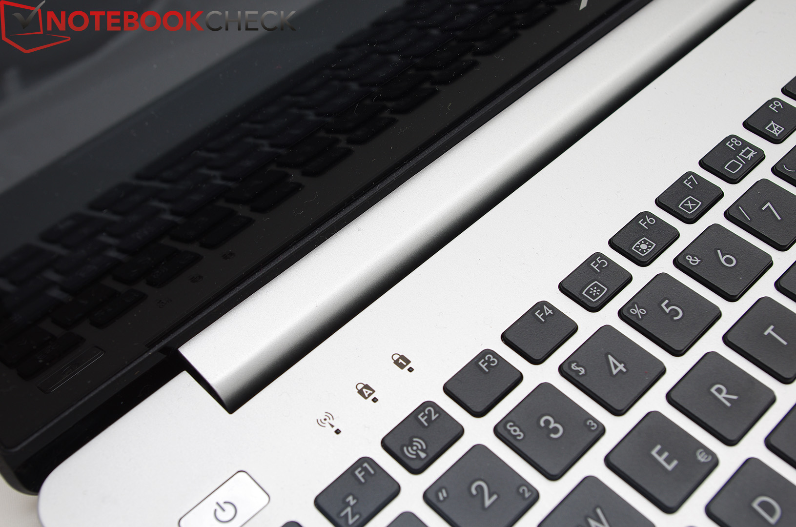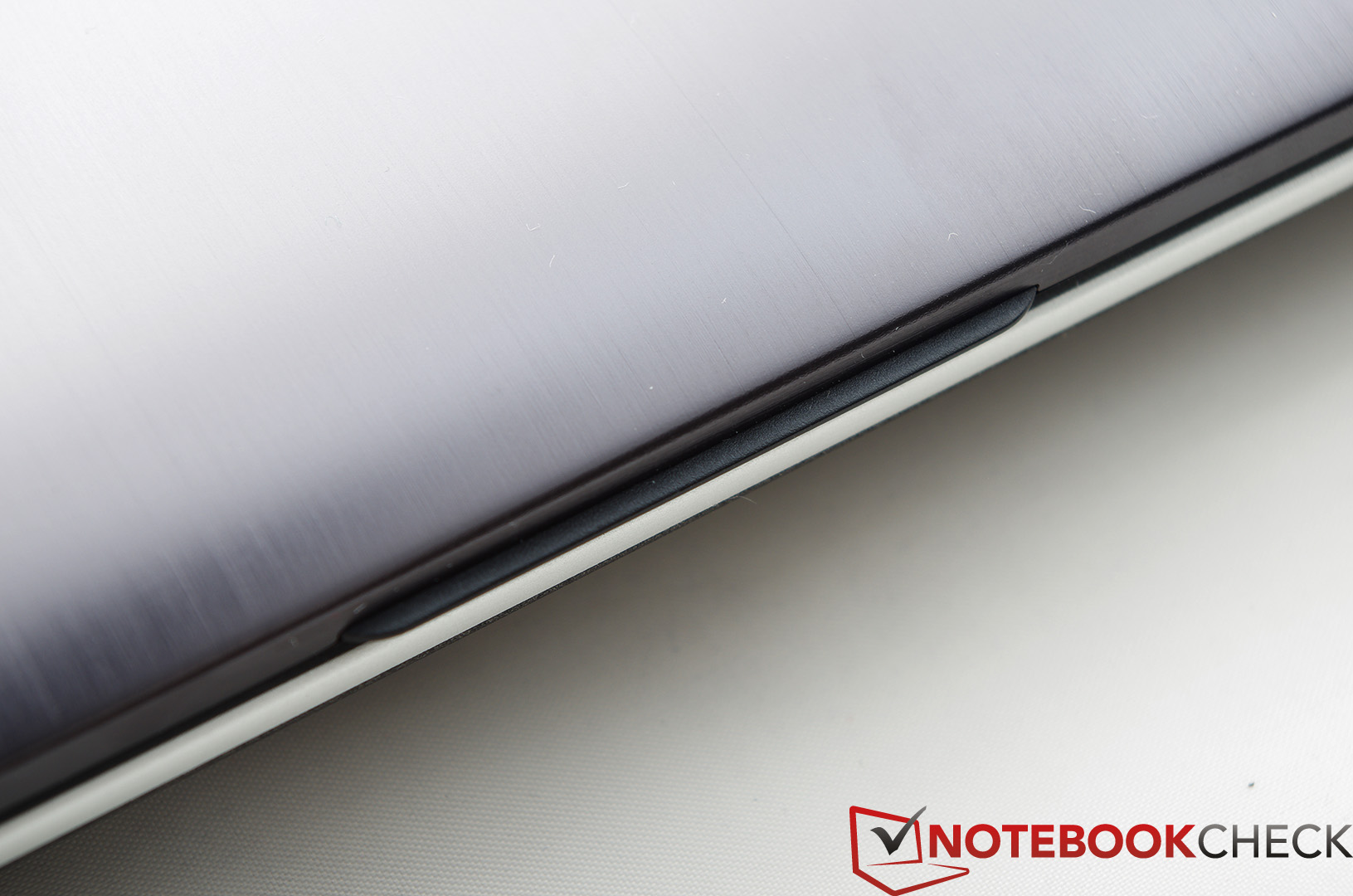 Durch Verwendung von Metall wird das Gehäuse an wichtigen Punkten stabilisiert. So gibt die Handballenauflage beim Auflegen der Hände nicht nach. Auch das einseitige Halten des VivoBook wird durch die Starrheit nicht zum Problem. Auch das Display-Scharnier profitiert davon. Dieses schließt das Notebook bündig mit dem Gehäuse. Das Aufklappen funktioniert mit leichtem Druck, sehr präzise und sauber. Leider ist der Winkel von rund 120° des geöffneten Gerätes sehr gering, was das Arbeiten im aufrechten Sitzen unter Umständen erschweren kann.