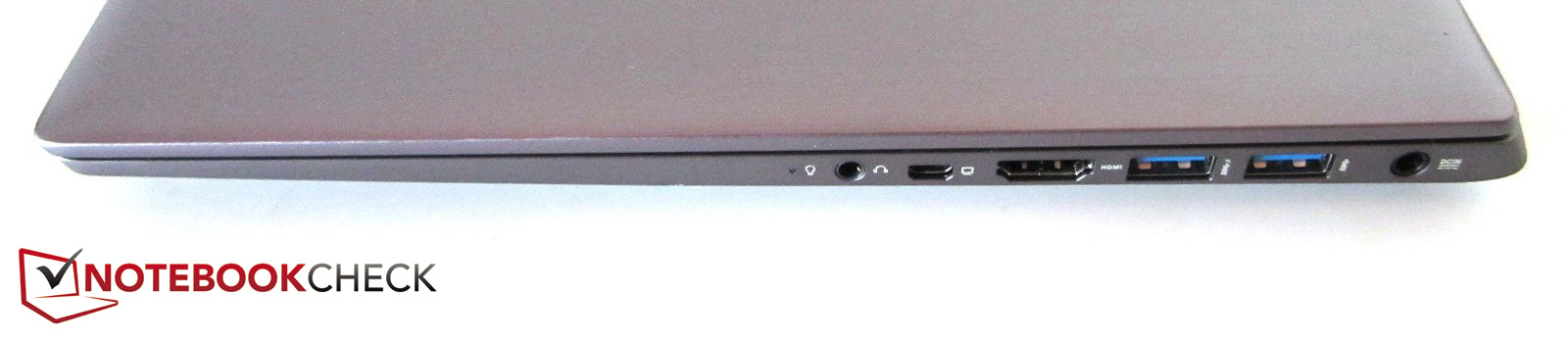 Während die linke Seite einen USB-3.0-Port und einen 3-in-1-Kartenleser beherbergt (SD, SDHC, MMC), enthält die rechte Seite einen Stromeingang, zwei weitere USB-3.0-Ports, einen HDMI-Ausgang und einen Mini-VGA-Anschluss. Halt, Mini-VGA? Richtig gelesen. Wegen der dünnen Baseunit hat Asus nicht nur auf einen Netzwerk-Anschluss, sondern auch auf einen vollwertigen VGA-Port verzichtet. Immerhin liegen dem Notebook zwei Adapter bei, welche das U38DT optional um einen analogen Bildausgang (VGA-auf-Mini-VGA) und einen Gigabit-Lan-Port (RJ-45-auf-USB-2.0) erweitern. Abgerundet wird die linke Seite von einer kombinierten Sound-Buche (Eingang + Ausgang).