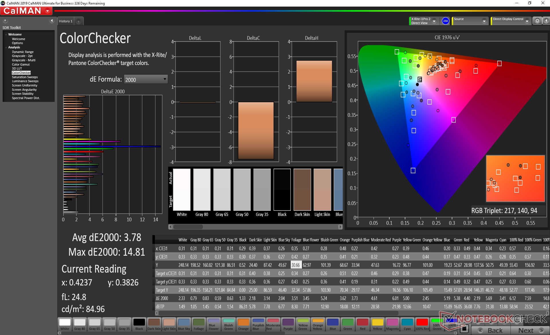Durch unsere Kalibrierung konnten wir das Graustufen-DeltaE von 4,6 auf 0,9 senken und die Darstellung bedeutend verbessern. Andererseits ändert sich die Farbgenauigkeit aufgrund der eingeschränkten Farbraumabdeckung des Panels nur unwesentlich. Blau wird im Vergleich zu anderen Primär- und Sekundärfarben besonders ungenau wiedergegeben.