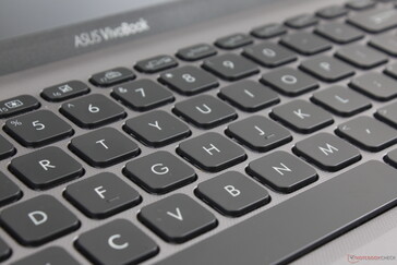 Die Größe, das Layout und das Tippgefühl der beleuchteten Tastatur gleichen der des VivoBook S15 S532. Die QWERTY-Standardtasten bieten angesichts des niedrigen Preises ein tolles Tastenfeedback, allerdings ist die Bedienung der winzigen Ziffernblock- und Pfeiltasten nicht zuletzt aufgrund ihres schwammigen Feedbacks relativ unkomfortabel.